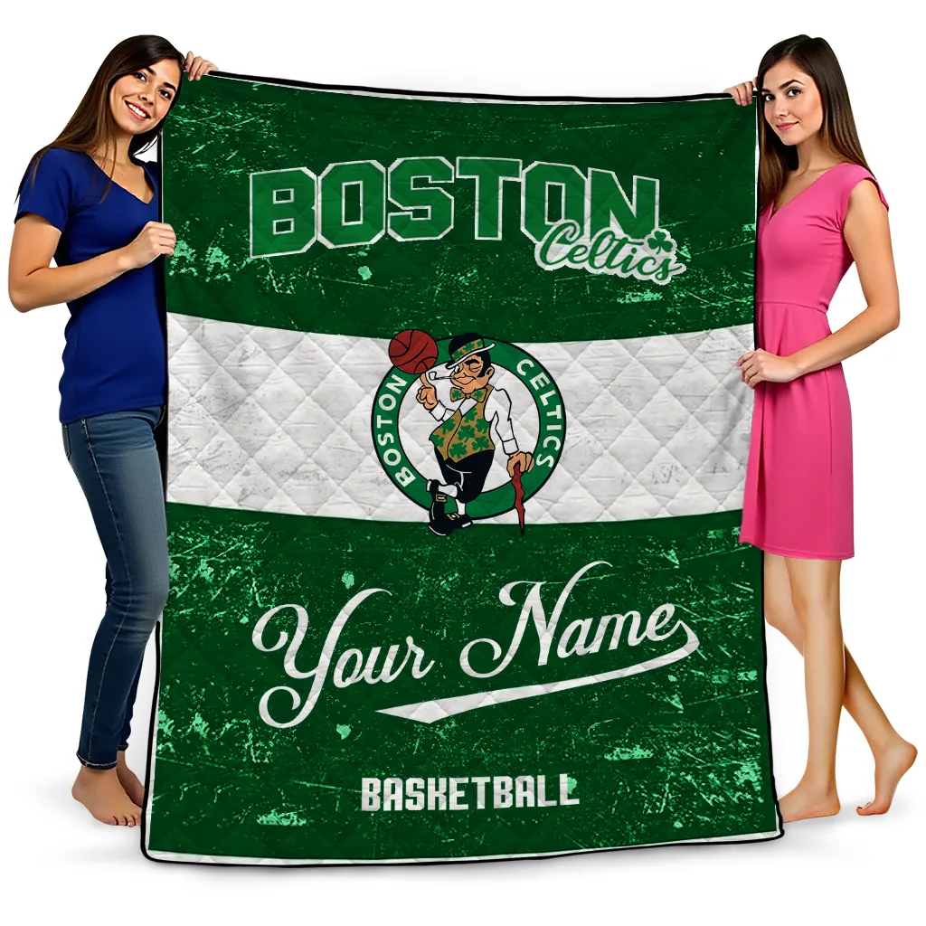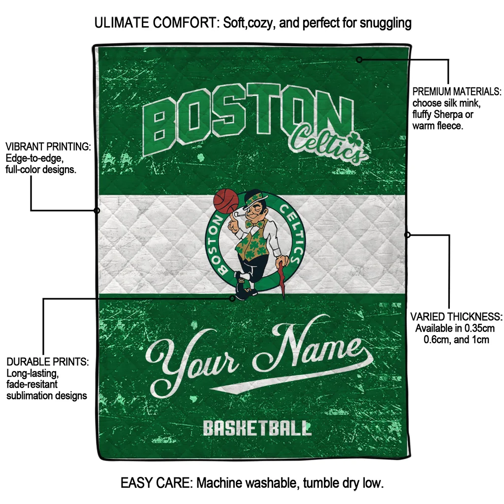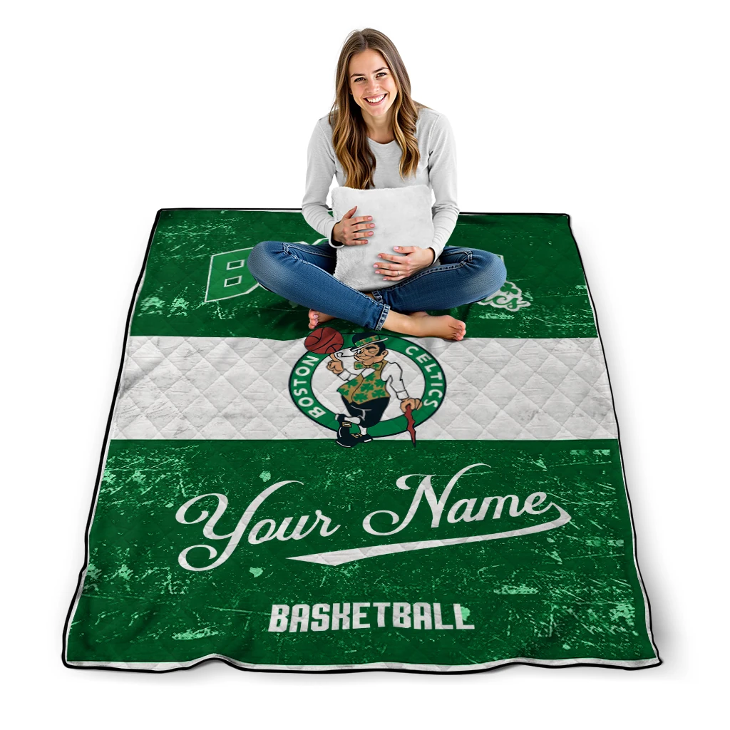 Wrap yourself in warmth and pride with the Custom Boston Celtics Helmet Fan Green White Quilt Blanket from the Boston Celtics Blankets collection at Yes That Blanket. Made from 100% premium quilting-weight polyester blended with a touch of microfiber, this quilt offers a smooth, soft finish you’ll love. Choose between two quilting styles—Stipple or Diagonal—and enjoy the comfort of a cotton-filled layer inside that adds extra coziness for every season. The border is available in classic black or white, giving your design a clean, timeless edge.