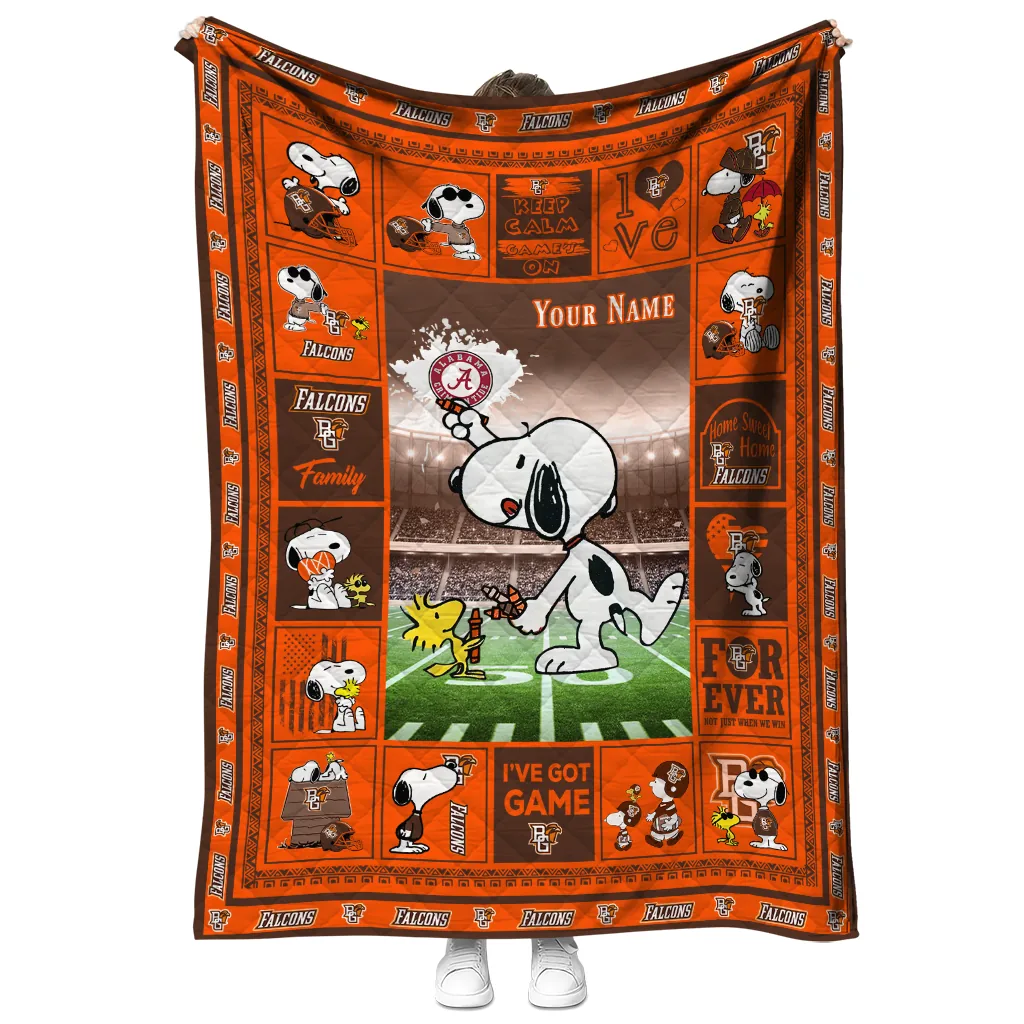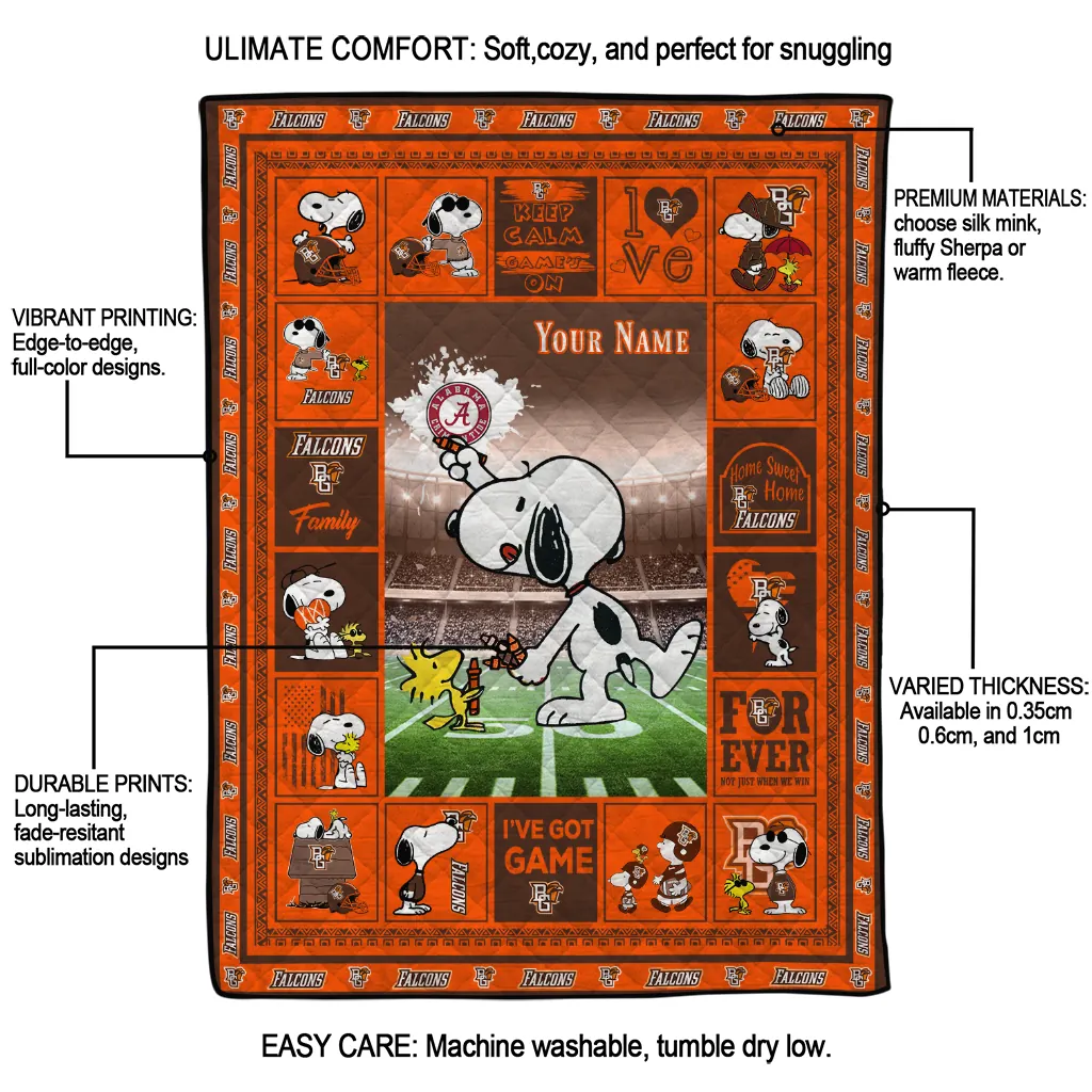 Wrap yourself in warmth and pride with the Custom Bowling Green Falcons Snoopy Coach Orange Quilt Blanket from the Bowling Green Falcons Blankets collection at Yes That Blanket. Made from 100% premium quilting-weight polyester blended with a touch of microfiber, this quilt offers a smooth, soft finish you’ll love. Choose between two quilting styles—Stipple or Diagonal—and enjoy the comfort of a cotton-filled layer inside that adds extra coziness for every season. The border is available in classic black or white, giving your design a clean, timeless edge.
