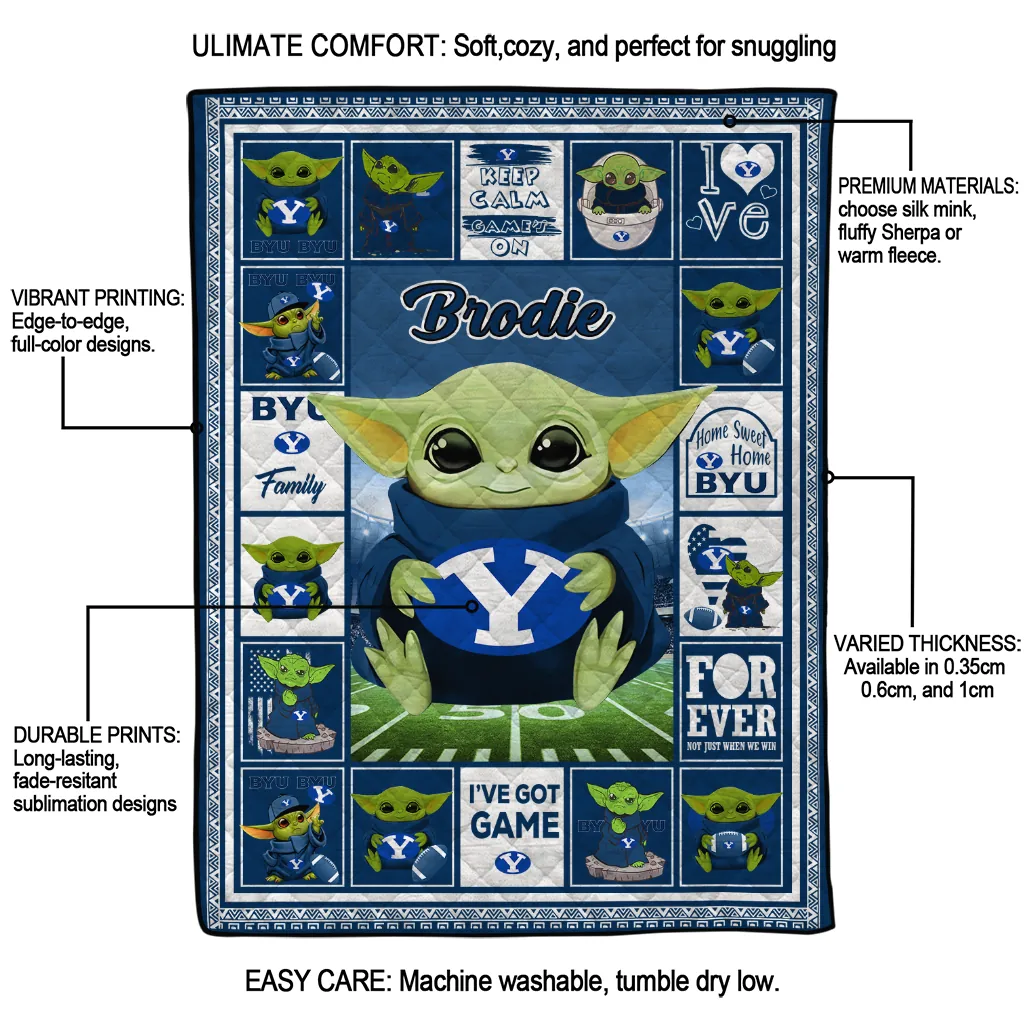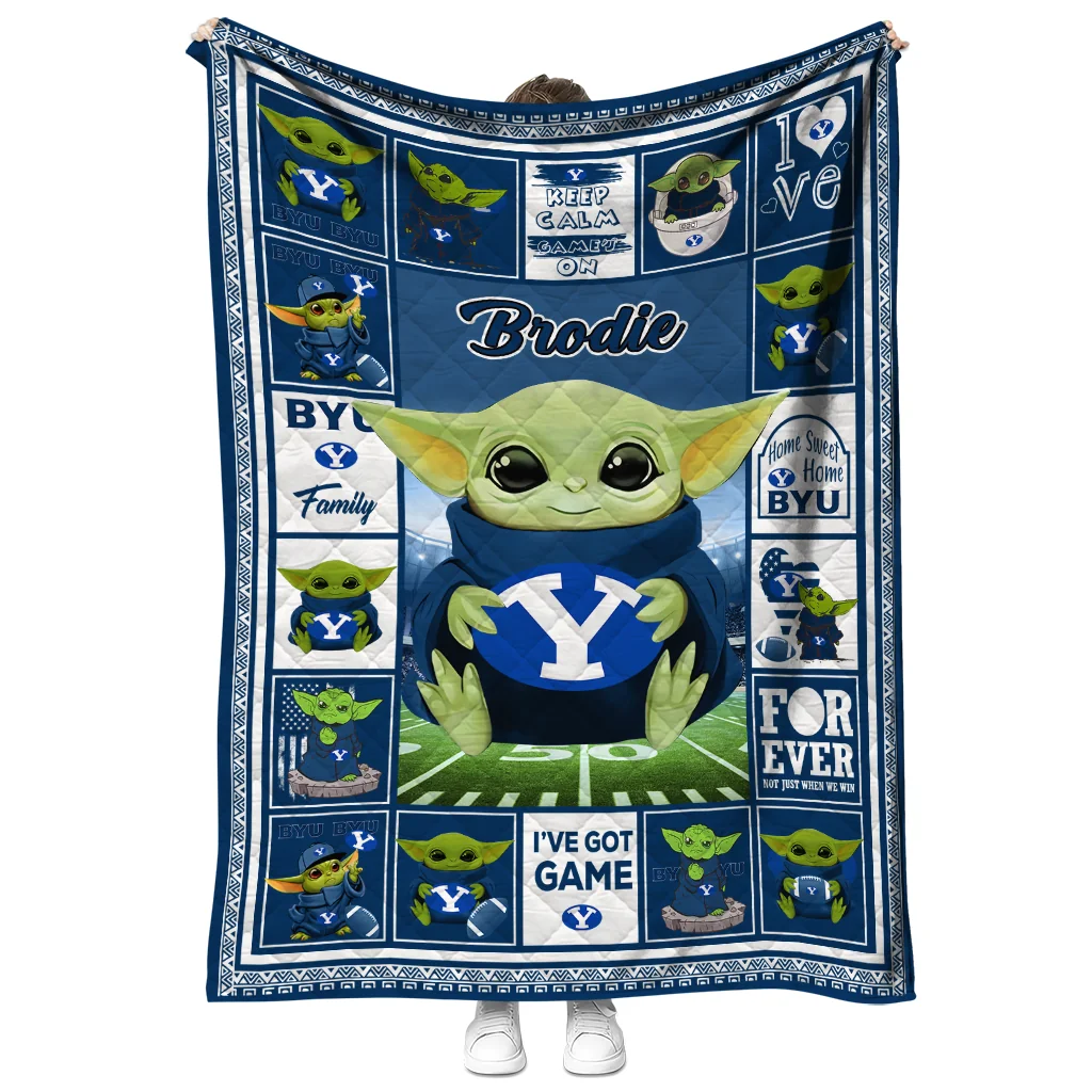 Wrap yourself in warmth and pride with the Custom BYU Cougars Yody Baby Pattern Blue Quilt Blanket from the BYU Cougars Blankets collection at Yes That Blanket. Made from 100% premium quilting-weight polyester blended with a touch of microfiber, this quilt offers a smooth, soft finish you’ll love. Choose between two quilting styles—Stipple or Diagonal—and enjoy the comfort of a cotton-filled layer inside that adds extra coziness for every season. The border is available in classic black or white, giving your design a clean, timeless edge.