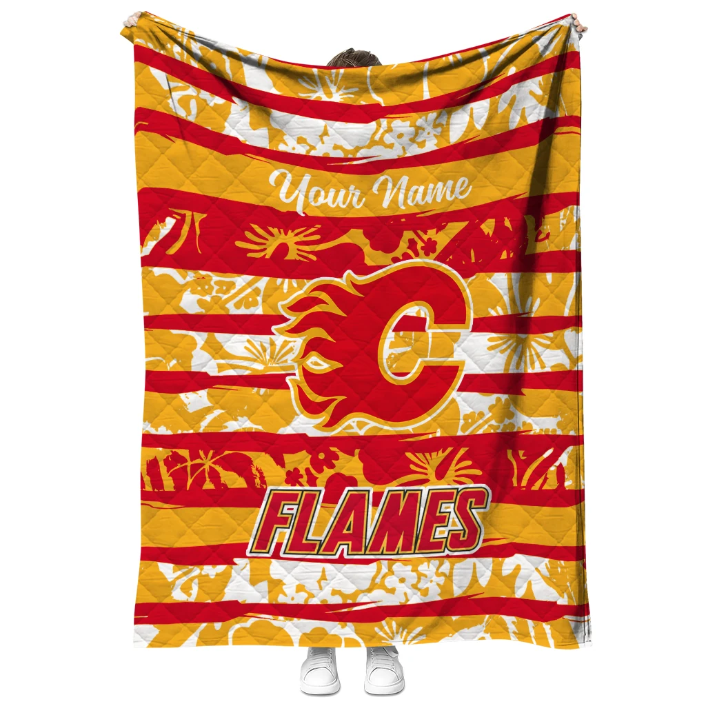 Wrap yourself in warmth and pride with the Custom Calgary Flames Layered Florals Red White Quilt Blanket from the Calgary Flames Blankets collection at Yes That Blanket. Made from 100% premium quilting-weight polyester blended with a touch of microfiber, this quilt offers a smooth, soft finish you’ll love. Choose between two quilting styles—Stipple or Diagonal—and enjoy the comfort of a cotton-filled layer inside that adds extra coziness for every season. The border is available in classic black or white, giving your design a clean, timeless edge.