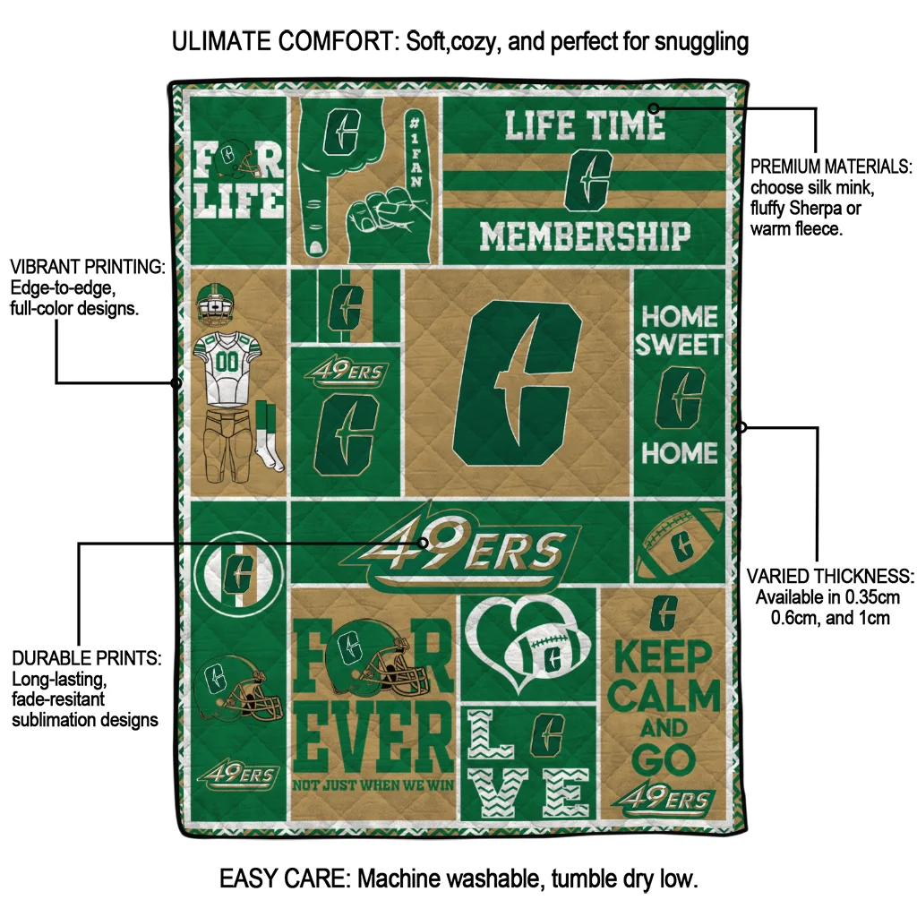 Wrap yourself in warmth and pride with the Custom Charlotte 49ers Helmet Passion Green Quilt Blanket from the Charlotte 49ers Blankets collection at Yes That Blanket. Made from 100% premium quilting-weight polyester blended with a touch of microfiber, this quilt offers a smooth, soft finish you’ll love. Choose between two quilting styles—Stipple or Diagonal—and enjoy the comfort of a cotton-filled layer inside that adds extra coziness for every season. The border is available in classic black or white, giving your design a clean, timeless edge.