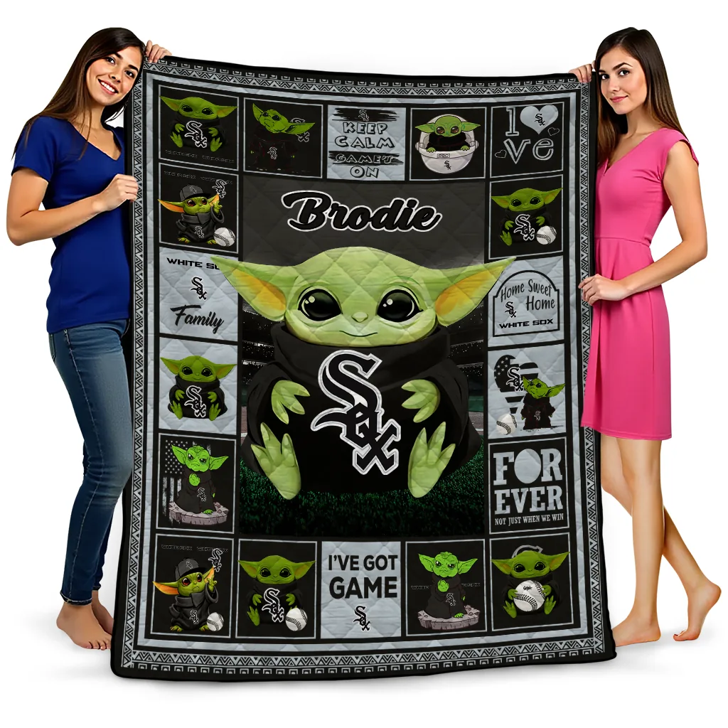 Wrap yourself in warmth and pride with the Custom Chicago White Sox Yody Baby Motif Black Quilt Blanket from the Chicago White Sox Blankets collection at Yes That Blanket. Made from 100% premium quilting-weight polyester blended with a touch of microfiber, this quilt offers a smooth, soft finish you’ll love. Choose between two quilting styles—Stipple or Diagonal—and enjoy the comfort of a cotton-filled layer inside that adds extra coziness for every season. The border is available in classic black or white, giving your design a clean, timeless edge.