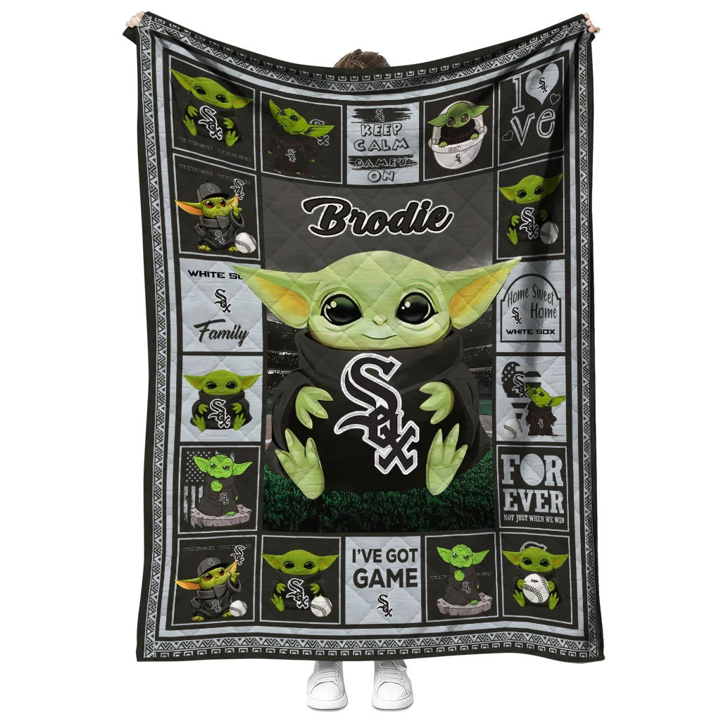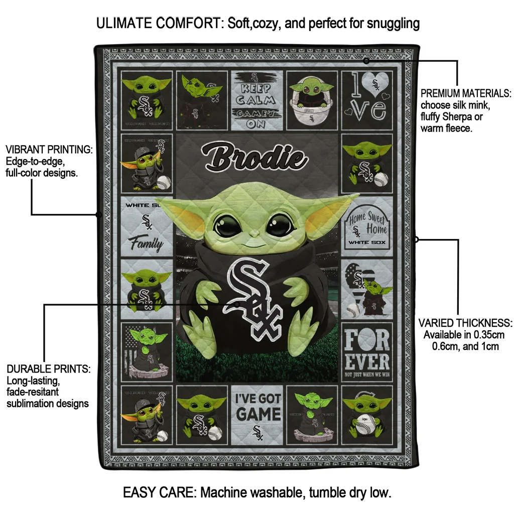 The Custom Chicago White Sox Yody Baby Motif Black Quilt Blanket is more than a blanket—it’s everyday comfort, thoughtfully made. Crafted from premium quilting fabric with a soft microfiber touch, it offers a smooth hand-feel and lasting coziness. Layered quilting with a cotton-filled core provides adaptable warmth across seasons while maintaining a clean, tailored look on your bed or sofa.