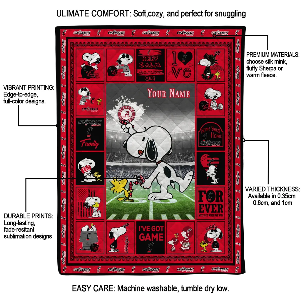 Wrap yourself in warmth and pride with the Custom Cincinnati Bearcats Snoopy Coach Red Quilt Blanket from the Cincinnati Bearcats Blankets collection at Yes That Blanket. Made from 100% premium quilting-weight polyester blended with a touch of microfiber, this quilt offers a smooth, soft finish you’ll love. Choose between two quilting styles—Stipple or Diagonal—and enjoy the comfort of a cotton-filled layer inside that adds extra coziness for every season. The border is available in classic black or white, giving your design a clean, timeless edge.
