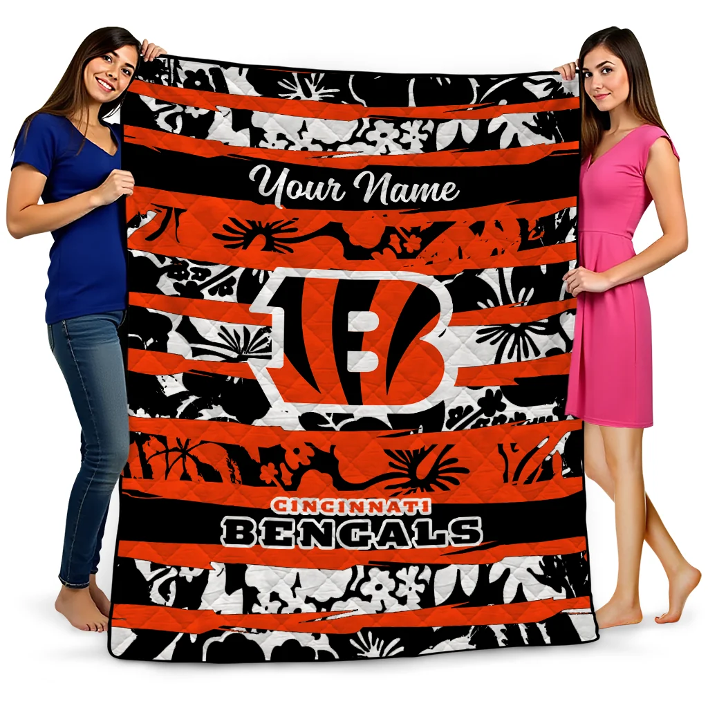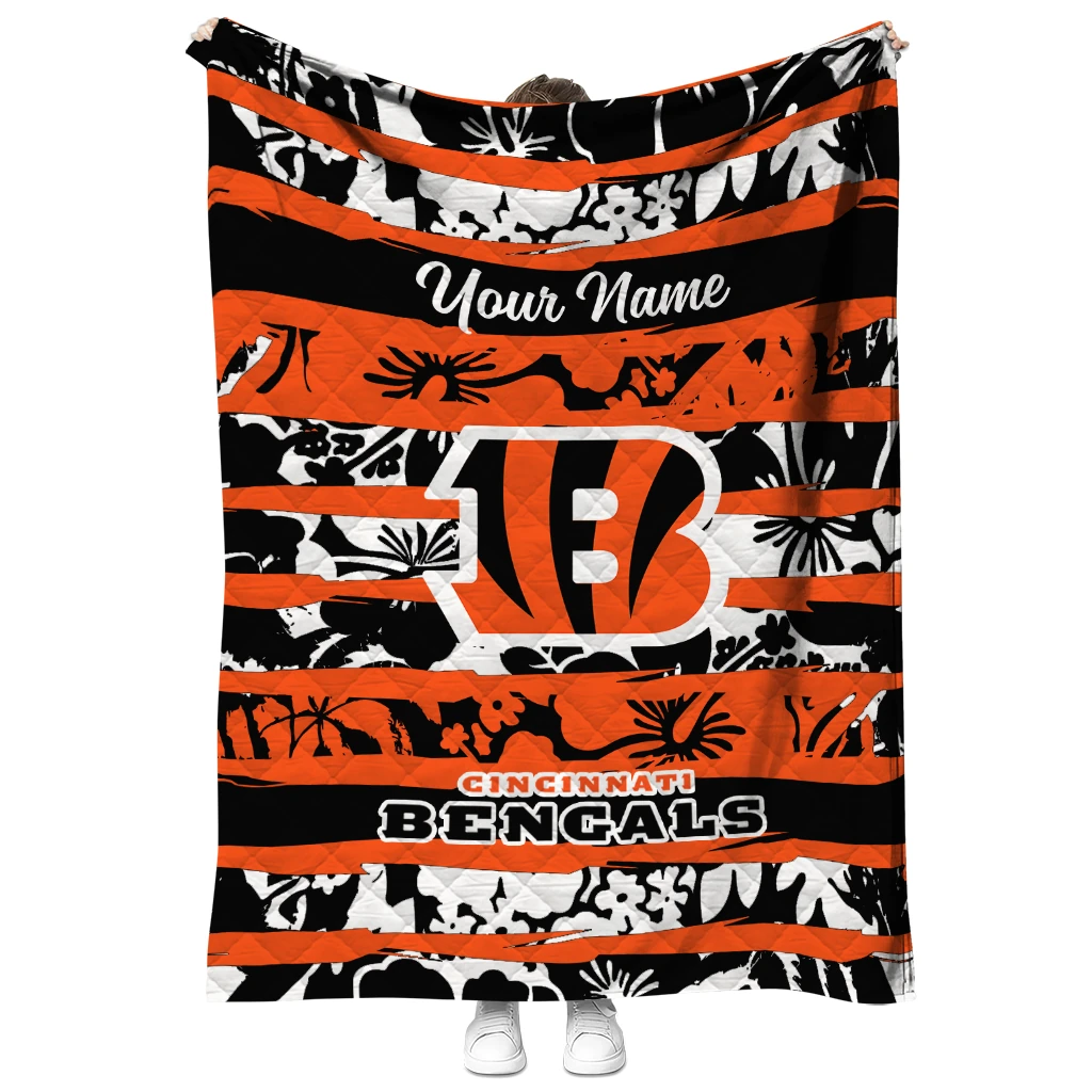 Wrap yourself in warmth and pride with the Custom Cincinnati Bengals Layered Florals Orange White Quilt Blanket from the Cincinnati Bengals Blankets collection at Yes That Blanket. Made from 100% premium quilting-weight polyester blended with a touch of microfiber, this quilt offers a smooth, soft finish you’ll love. Choose between two quilting styles—Stipple or Diagonal—and enjoy the comfort of a cotton-filled layer inside that adds extra coziness for every season. The border is available in classic black or white, giving your design a clean, timeless edge.
