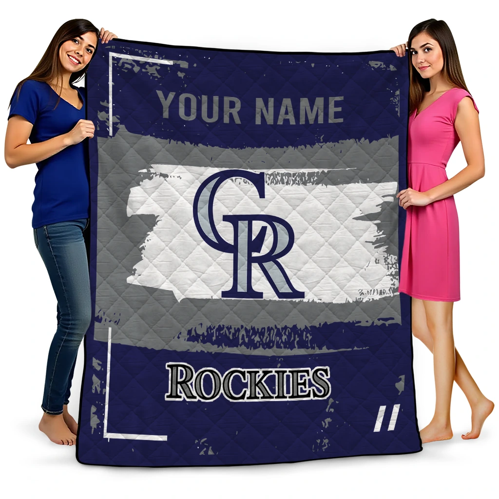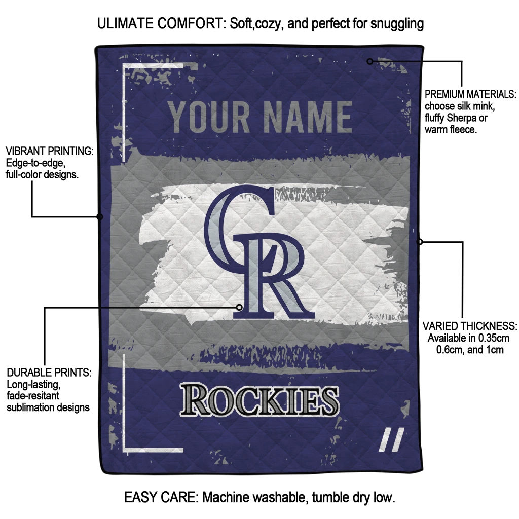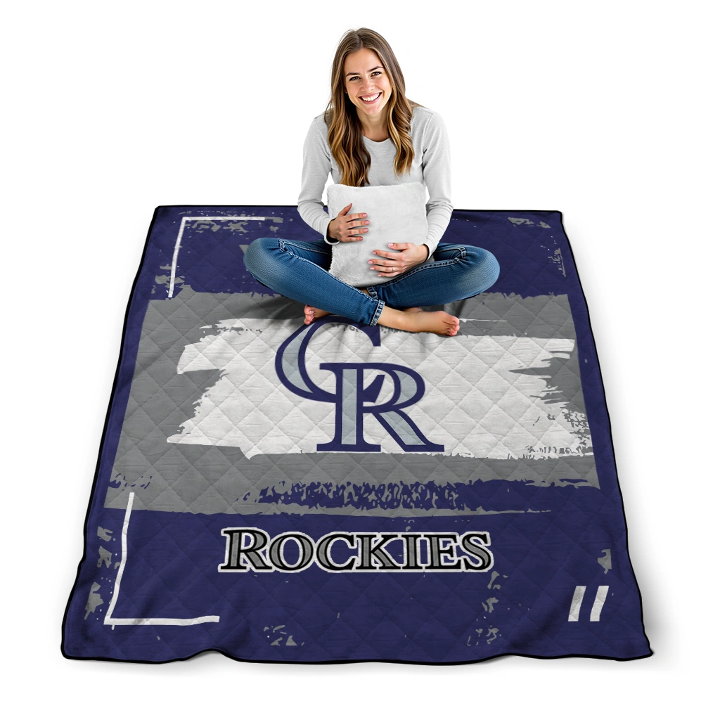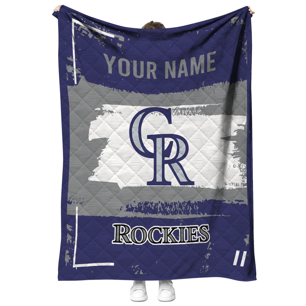 Wrap yourself in warmth and pride with the Custom Colorado Rockies Grunge Patch Blue White Quilt Blanket from the Colorado Rockies Blankets collection at Yes That Blanket. Made from 100% premium quilting-weight polyester blended with a touch of microfiber, this quilt offers a smooth, soft finish you’ll love. Choose between two quilting styles—Stipple or Diagonal—and enjoy the comfort of a cotton-filled layer inside that adds extra coziness for every season. The border is available in classic black or white, giving your design a clean, timeless edge.