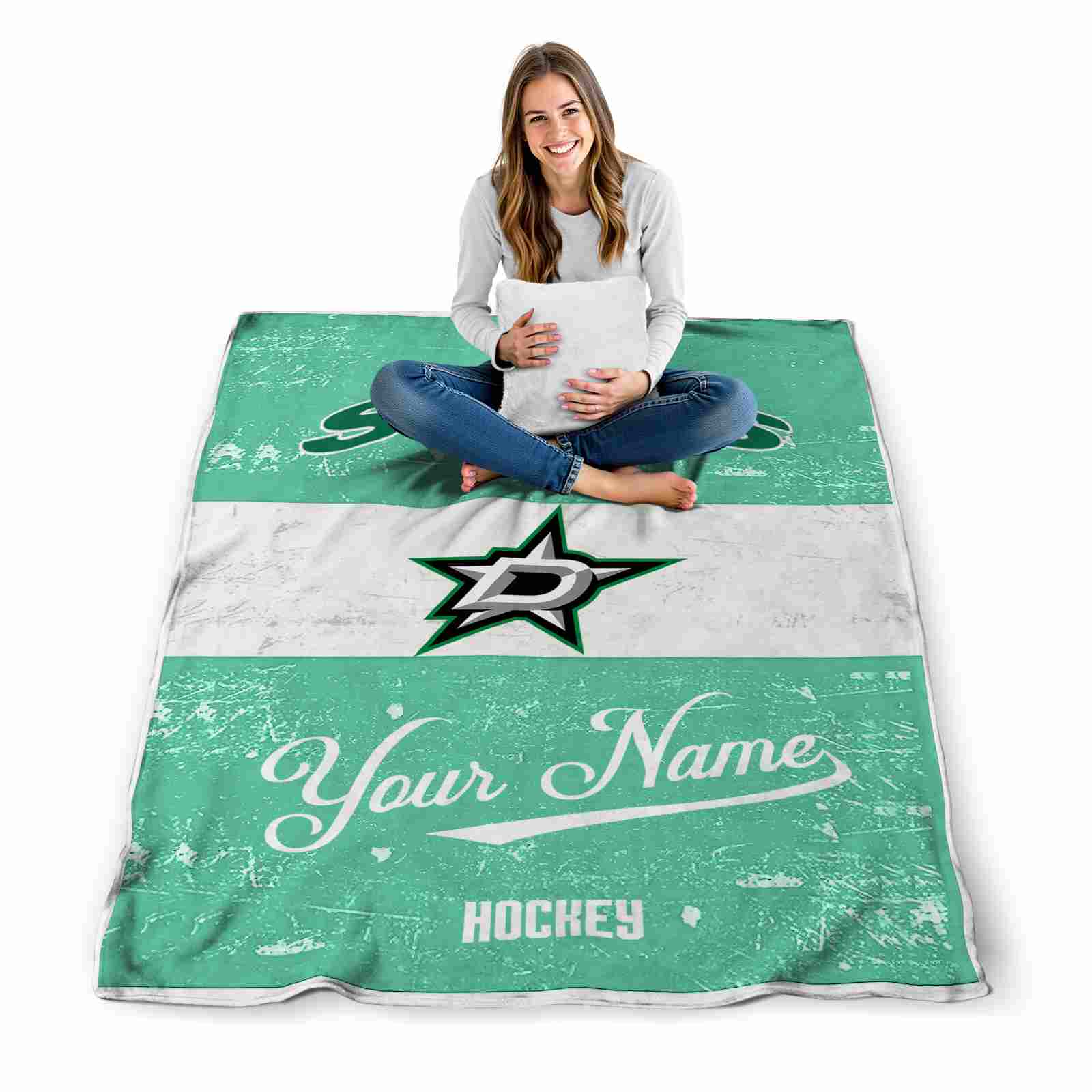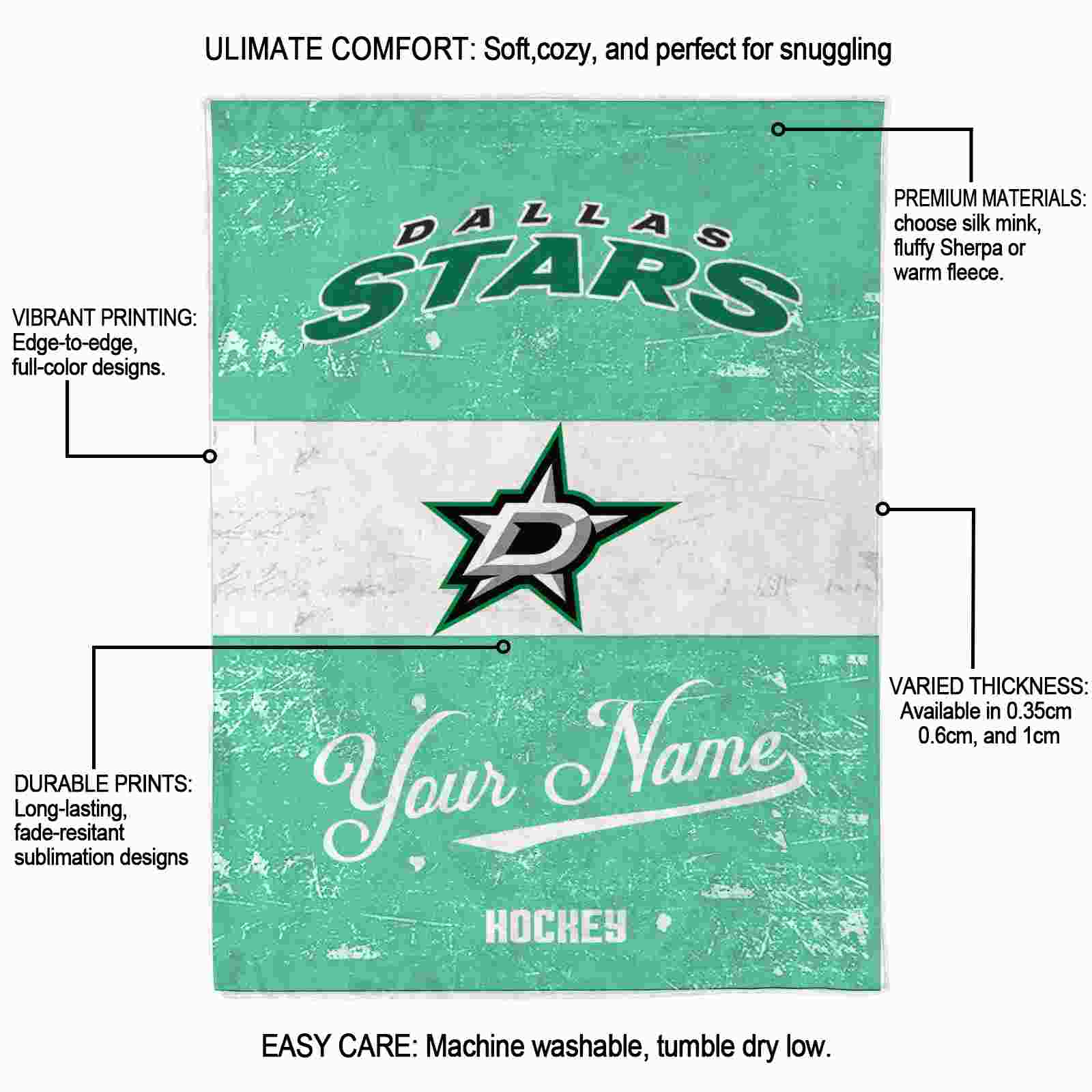 Without a doubt, the Custom Dallas Stars Grunge Texture Green White Blanket from Dallas Stars Blankets collection is offering true fans a chance to showcase passion in a cool way. Personalize it with your favorite team's logo or a meaningful name to make it uniquely yours. Isn't that great? The full-color print ensures vibrant, edge-to-edge designs, bringing your sports enthusiasm to life!
