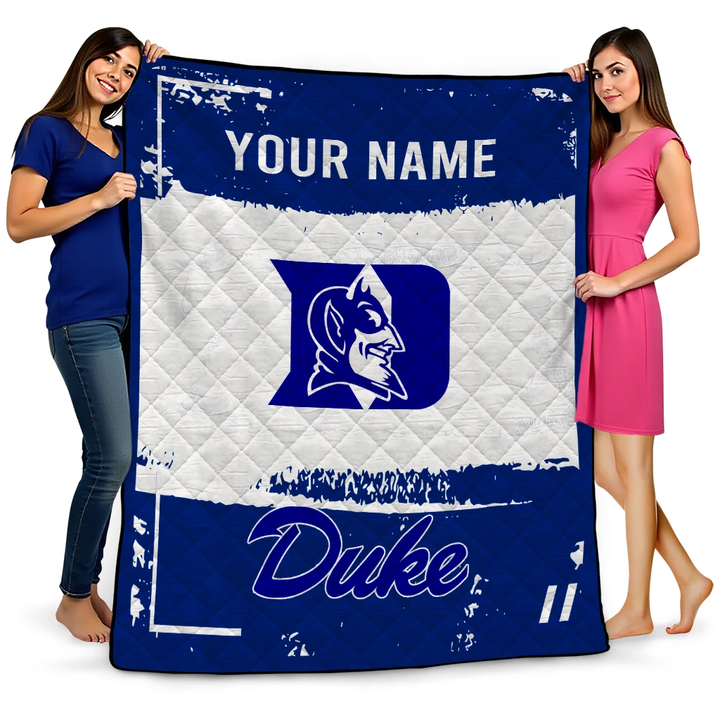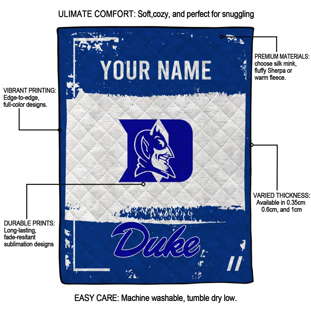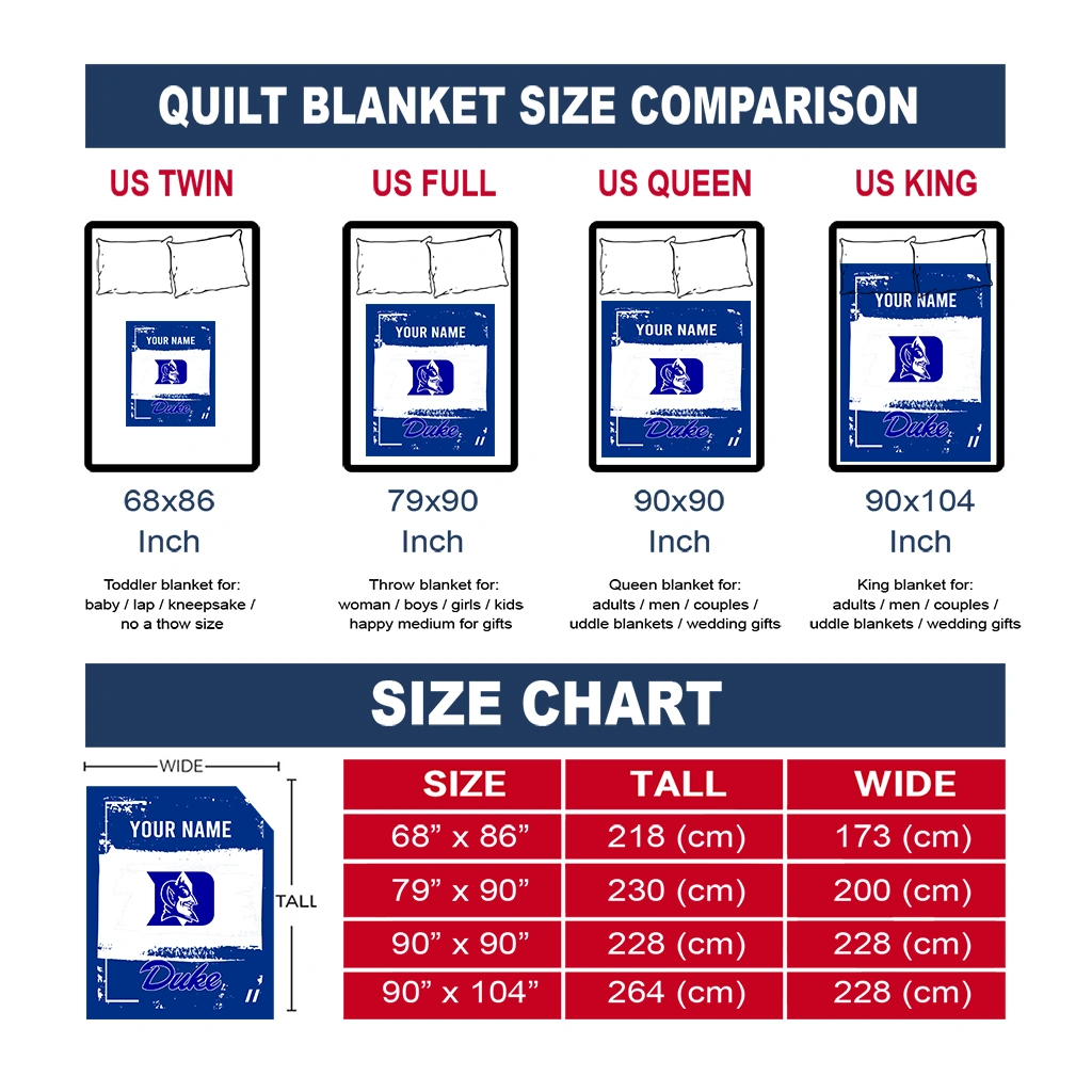 The Custom Duke Blue Devils Grunge Patch Blue White Quilt Blanket is more than a blanket—it’s everyday comfort, thoughtfully made. Crafted from premium quilting fabric with a soft microfiber touch, it offers a smooth hand-feel and lasting coziness. Layered quilting with a cotton-filled core provides adaptable warmth across seasons while maintaining a clean, tailored look on your bed or sofa.