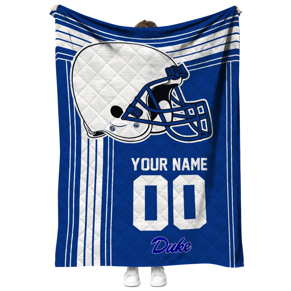 Wrap yourself in warmth and pride with the Custom Duke Blue Devils Helmet Theme Blue Quilt Blanket from the Duke Blue Devils Blankets collection at Yes That Blanket. Made from 100% premium quilting-weight polyester blended with a touch of microfiber, this quilt offers a smooth, soft finish you’ll love. Choose between two quilting styles—Stipple or Diagonal—and enjoy the comfort of a cotton-filled layer inside that adds extra coziness for every season. The border is available in classic black or white, giving your design a clean, timeless edge.
