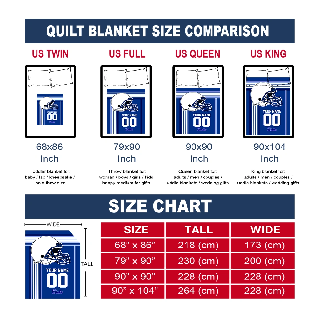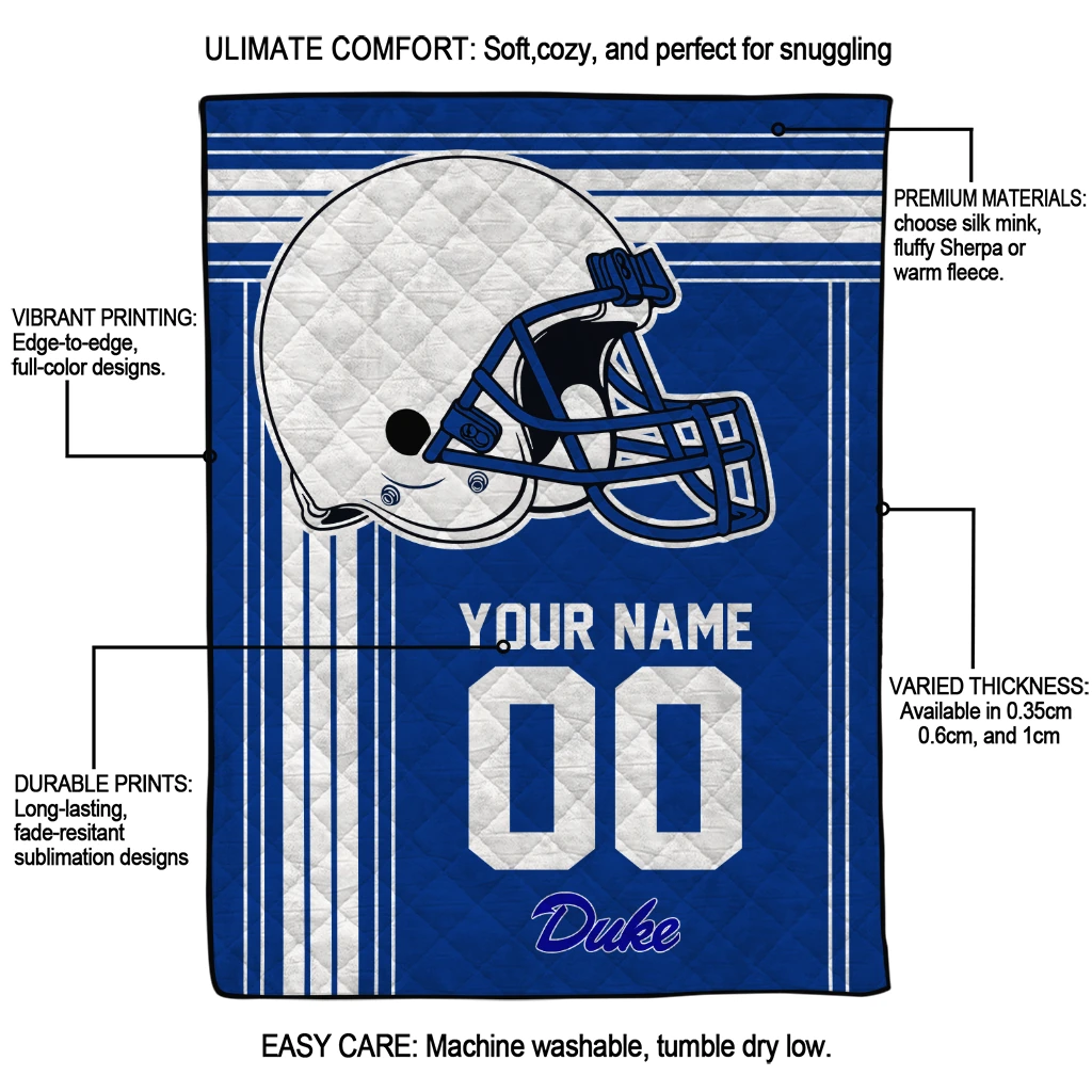 The Custom Duke Blue Devils Helmet Theme Blue Quilt Blanket is more than a blanket—it’s everyday comfort, thoughtfully made. Crafted from premium quilting fabric with a soft microfiber touch, it offers a smooth hand-feel and lasting coziness. Layered quilting with a cotton-filled core provides adaptable warmth across seasons while maintaining a clean, tailored look on your bed or sofa.