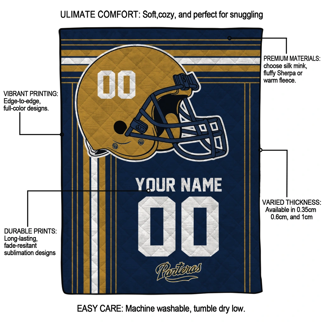 Wrap yourself in warmth and pride with the Custom FIU Panthers Helmet Theme Blue Quilt Blanket from the FIU Panthers Blankets collection at Yes That Blanket. Made from 100% premium quilting-weight polyester blended with a touch of microfiber, this quilt offers a smooth, soft finish you’ll love. Choose between two quilting styles—Stipple or Diagonal—and enjoy the comfort of a cotton-filled layer inside that adds extra coziness for every season. The border is available in classic black or white, giving your design a clean, timeless edge.
