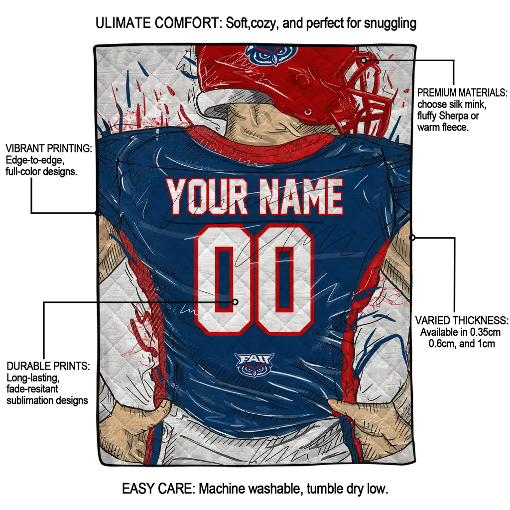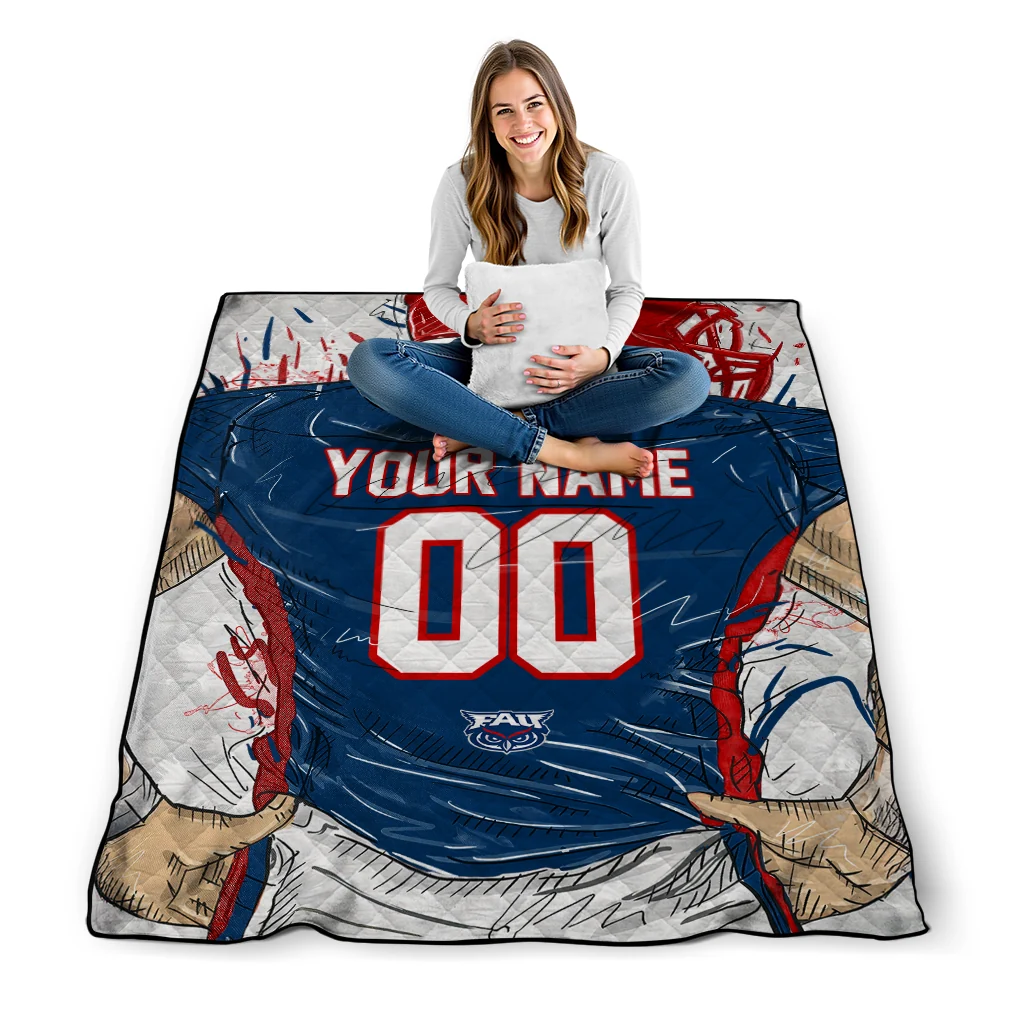 Custom Florida Atlantic Owls Player Sketch Blue Gray Quilt Blanket