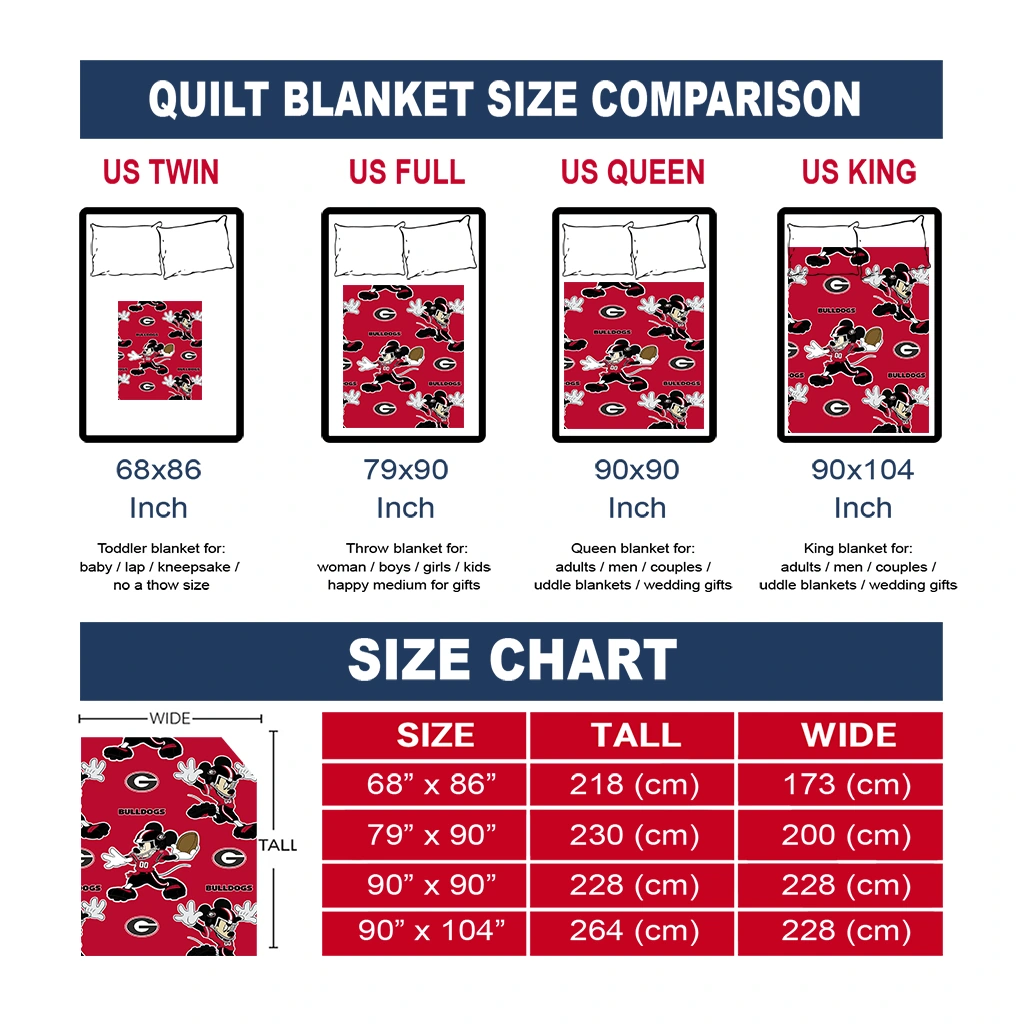 The Custom Georgia Bulldogs Mickey Football Red Quilt Blanket is more than a blanket—it’s everyday comfort, thoughtfully made. Crafted from premium quilting fabric with a soft microfiber touch, it offers a smooth hand-feel and lasting coziness. Layered quilting with a cotton-filled core provides adaptable warmth across seasons while maintaining a clean, tailored look on your bed or sofa.