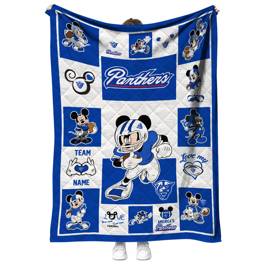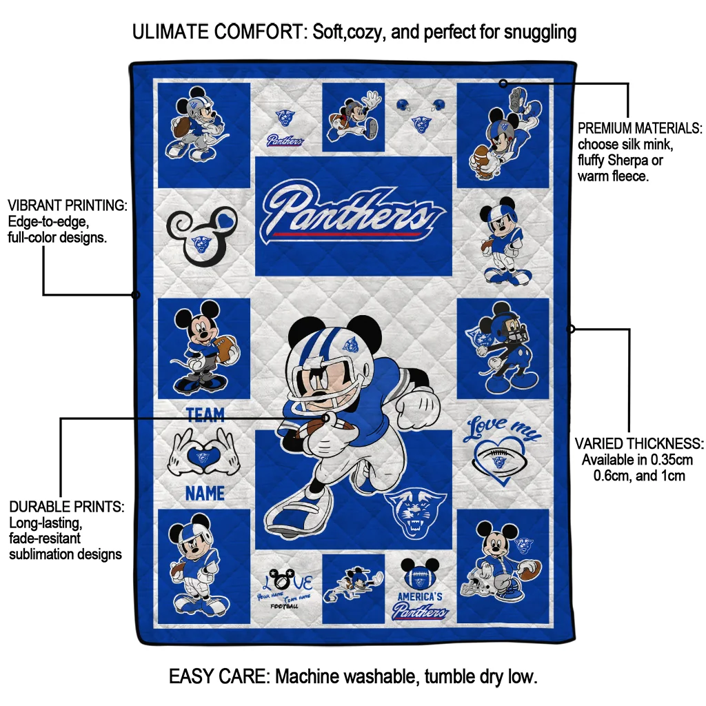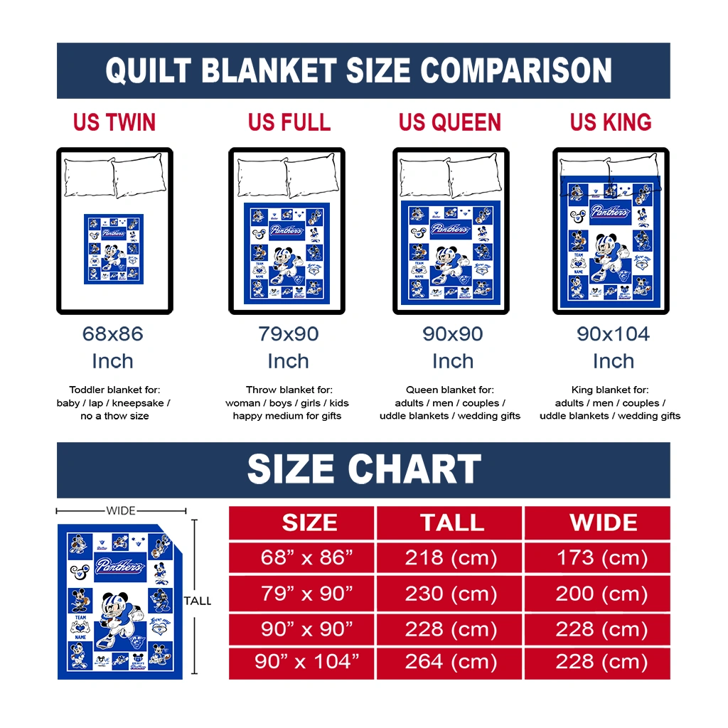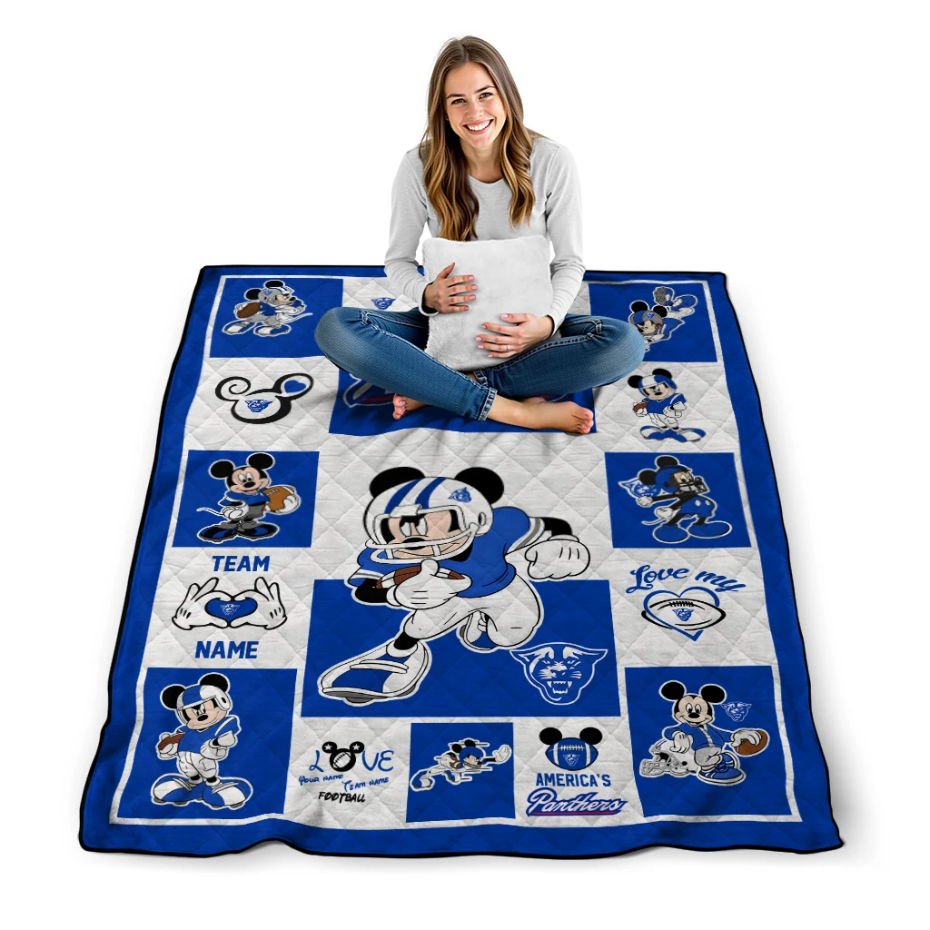 Wrap yourself in warmth and pride with the Custom Georgia State Panthers Mickey Crimson Blue White Quilt Blanket from the Georgia State Panthers Blankets collection at Yes That Blanket. Made from 100% premium quilting-weight polyester blended with a touch of microfiber, this quilt offers a smooth, soft finish you’ll love. Choose between two quilting styles—Stipple or Diagonal—and enjoy the comfort of a cotton-filled layer inside that adds extra coziness for every season. The border is available in classic black or white, giving your design a clean, timeless edge.
