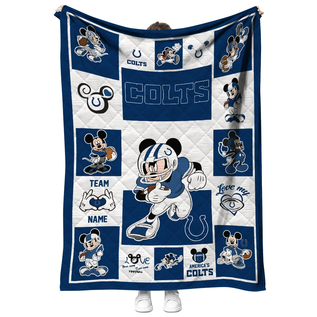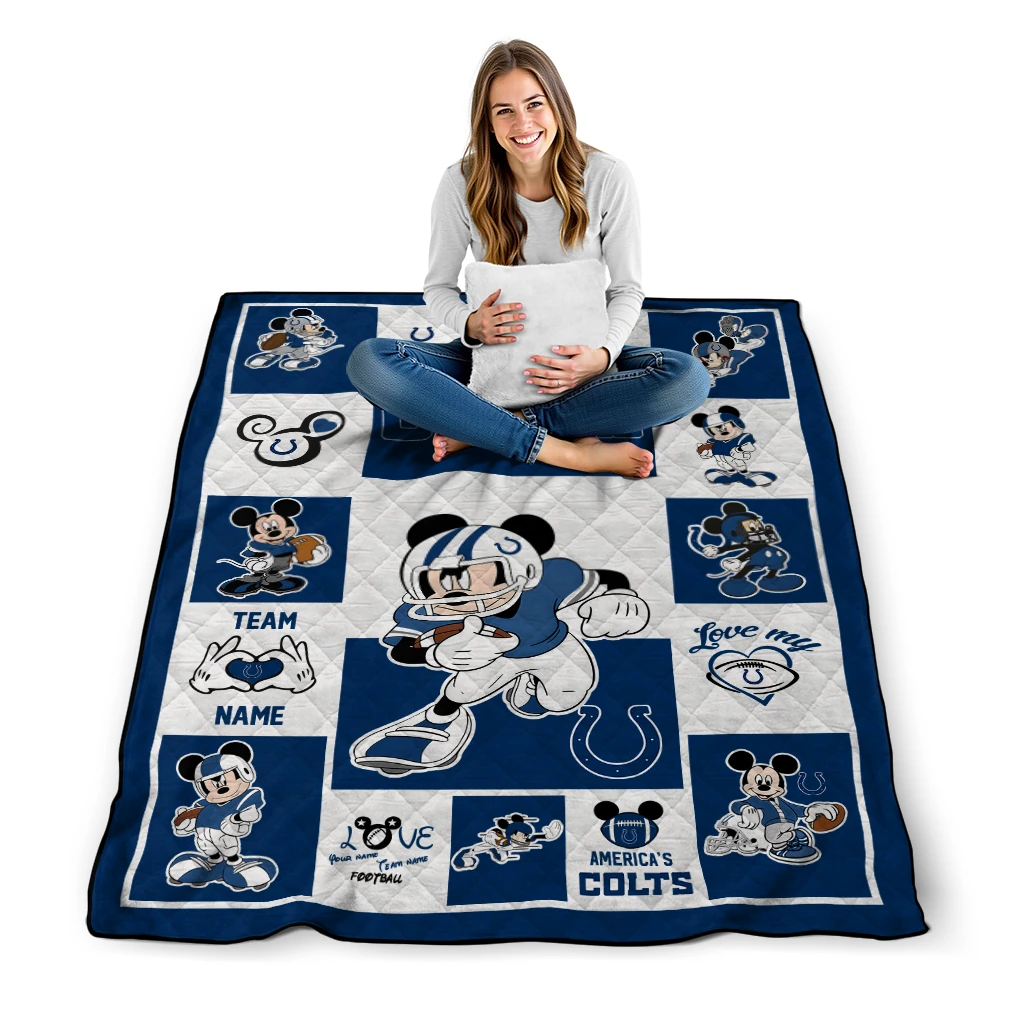 Wrap yourself in warmth and pride with the Custom Indianapolis Colts Mickey Crimson Blue White Quilt Blanket from the Indianapolis Colts Blankets collection at Yes That Blanket. Made from 100% premium quilting-weight polyester blended with a touch of microfiber, this quilt offers a smooth, soft finish you’ll love. Choose between two quilting styles—Stipple or Diagonal—and enjoy the comfort of a cotton-filled layer inside that adds extra coziness for every season. The border is available in classic black or white, giving your design a clean, timeless edge.