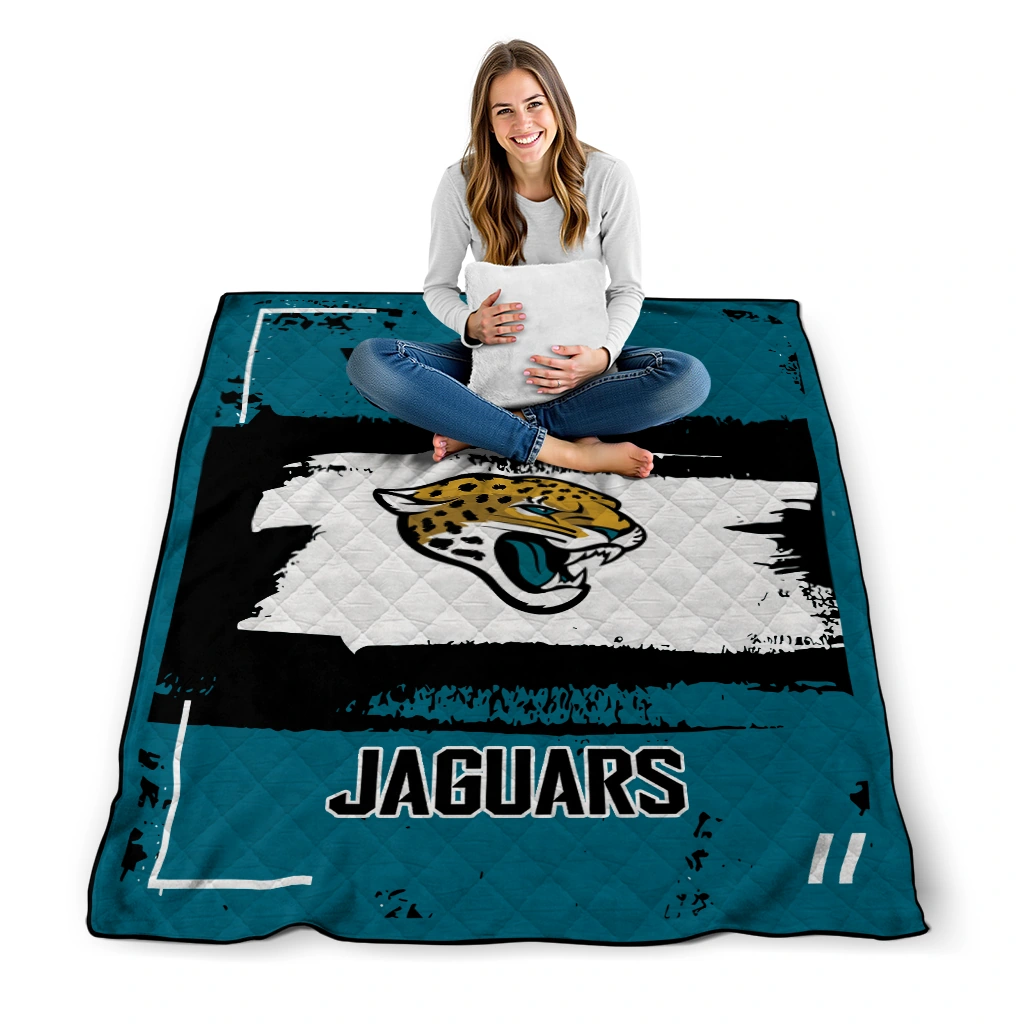 The Custom Jacksonville Jaguars Grunge Patch Teal White Quilt Blanket is more than a blanket—it’s everyday comfort, thoughtfully made. Crafted from premium quilting fabric with a soft microfiber touch, it offers a smooth hand-feel and lasting coziness. Layered quilting with a cotton-filled core provides adaptable warmth across seasons while maintaining a clean, tailored look on your bed or sofa.