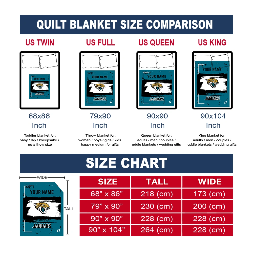 Wrap yourself in warmth and pride with the Custom Jacksonville Jaguars Grunge Patch Teal White Quilt Blanket from the Jacksonville Jaguars Blankets collection at Yes That Blanket. Made from 100% premium quilting-weight polyester blended with a touch of microfiber, this quilt offers a smooth, soft finish you’ll love. Choose between two quilting styles—Stipple or Diagonal—and enjoy the comfort of a cotton-filled layer inside that adds extra coziness for every season. The border is available in classic black or white, giving your design a clean, timeless edge.