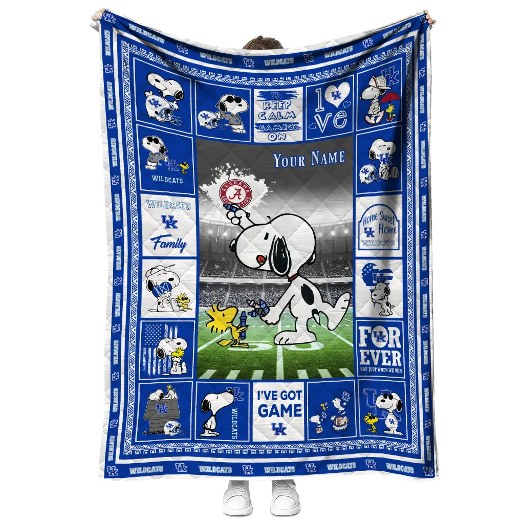 Wrap yourself in warmth and pride with the Custom Kentucky Wildcats Snoopy Coach Blue Quilt Blanket from the Kentucky Wildcats Blankets collection at Yes That Blanket. Made from 100% premium quilting-weight polyester blended with a touch of microfiber, this quilt offers a smooth, soft finish you’ll love. Choose between two quilting styles—Stipple or Diagonal—and enjoy the comfort of a cotton-filled layer inside that adds extra coziness for every season. The border is available in classic black or white, giving your design a clean, timeless edge.