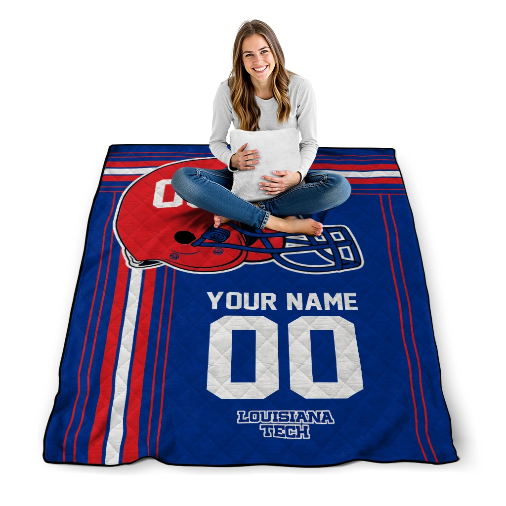 Wrap yourself in warmth and pride with the Custom LA Tech Helmet Theme Blue Quilt Blanket from the LA Tech Blankets collection at Yes That Blanket. Made from 100% premium quilting-weight polyester blended with a touch of microfiber, this quilt offers a smooth, soft finish you’ll love. Choose between two quilting styles—Stipple or Diagonal—and enjoy the comfort of a cotton-filled layer inside that adds extra coziness for every season. The border is available in classic black or white, giving your design a clean, timeless edge.