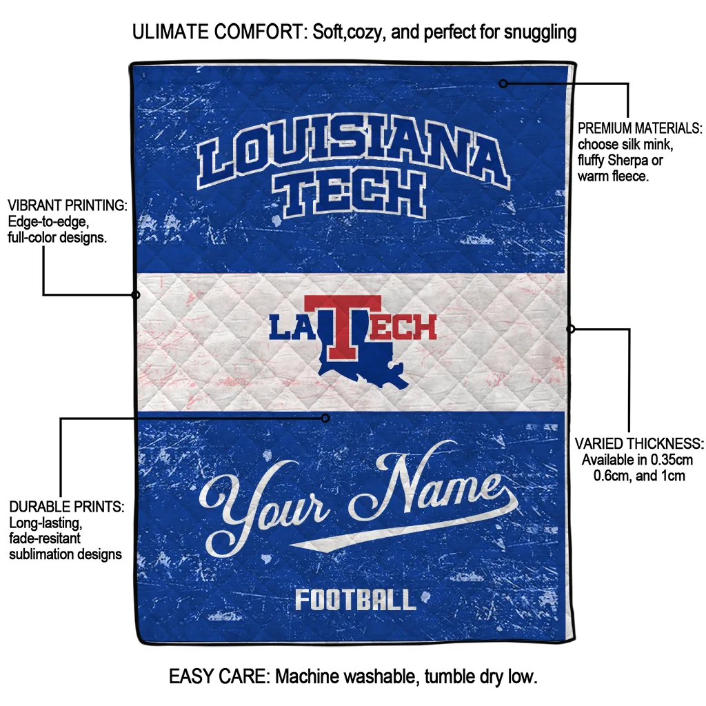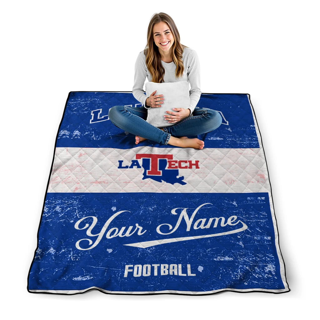 Wrap yourself in warmth and pride with the Custom LA Tech Hibiscus Burst Blue White Quilt Blanket from the LA Tech Blankets collection at Yes That Blanket. Made from 100% premium quilting-weight polyester blended with a touch of microfiber, this quilt offers a smooth, soft finish you’ll love. Choose between two quilting styles—Stipple or Diagonal—and enjoy the comfort of a cotton-filled layer inside that adds extra coziness for every season. The border is available in classic black or white, giving your design a clean, timeless edge.