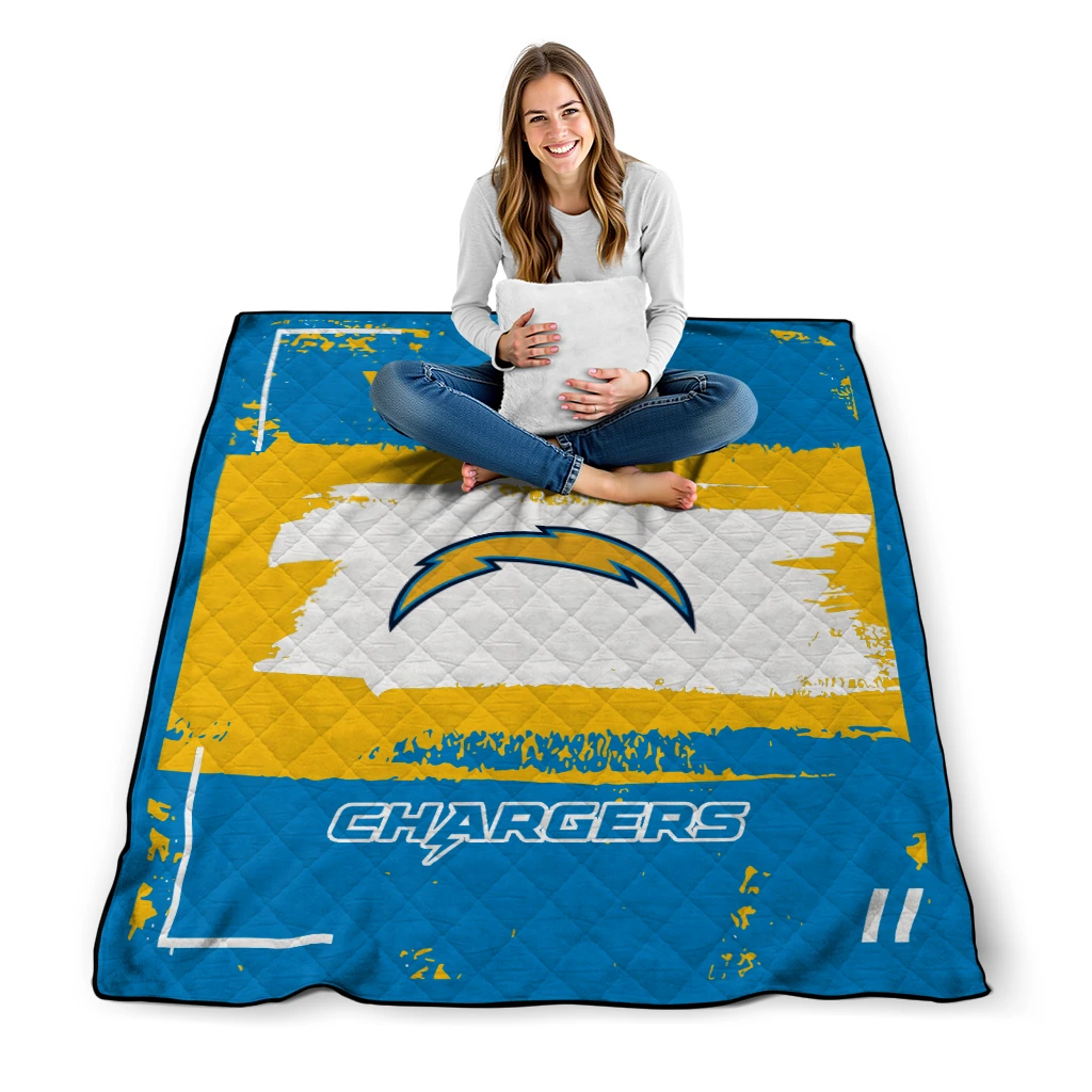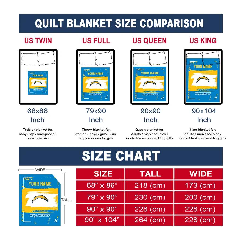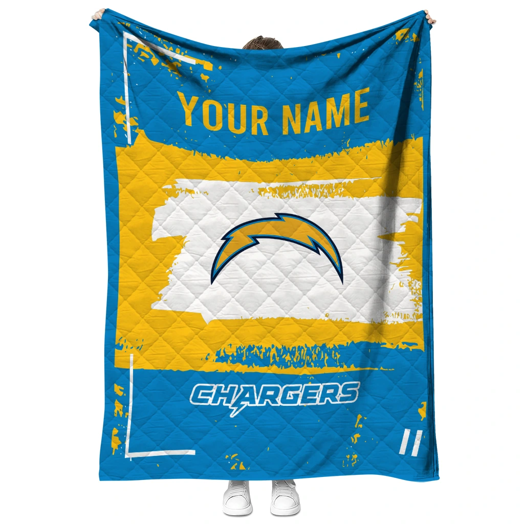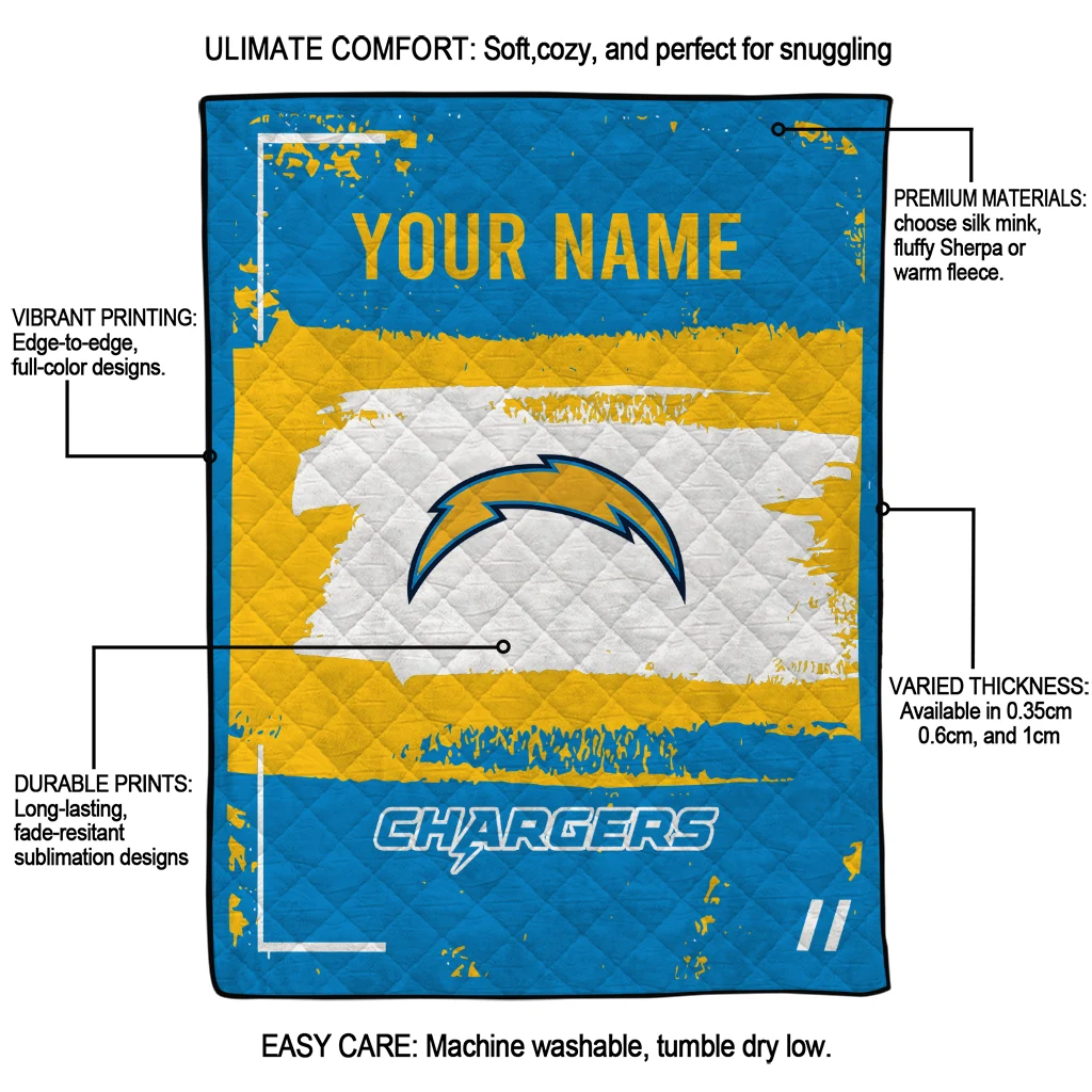 Wrap yourself in warmth and pride with the Custom Los Angeles Chargers Grunge Patch Blue White Quilt Blanket from the Los Angeles Chargers Blankets collection at Yes That Blanket. Made from 100% premium quilting-weight polyester blended with a touch of microfiber, this quilt offers a smooth, soft finish you’ll love. Choose between two quilting styles—Stipple or Diagonal—and enjoy the comfort of a cotton-filled layer inside that adds extra coziness for every season. The border is available in classic black or white, giving your design a clean, timeless edge.