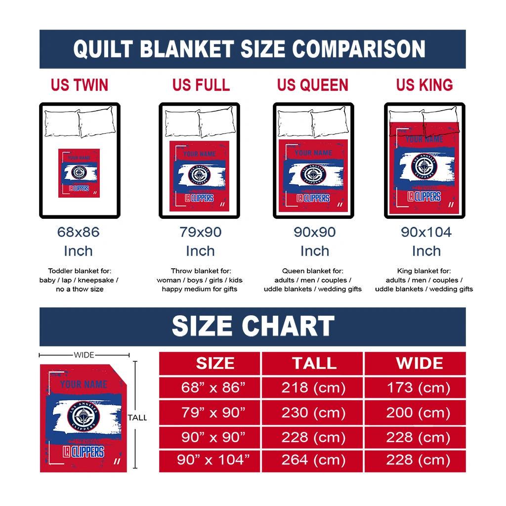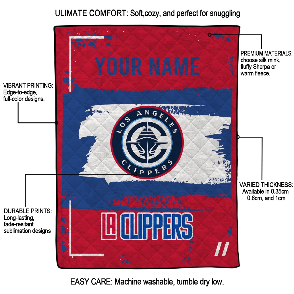 Wrap yourself in warmth and pride with the Custom Los Angeles Clippers Grunge Patch Red White Quilt Blanket from the Los Angeles Clippers Blankets collection at Yes That Blanket. Made from 100% premium quilting-weight polyester blended with a touch of microfiber, this quilt offers a smooth, soft finish you’ll love. Choose between two quilting styles—Stipple or Diagonal—and enjoy the comfort of a cotton-filled layer inside that adds extra coziness for every season. The border is available in classic black or white, giving your design a clean, timeless edge.