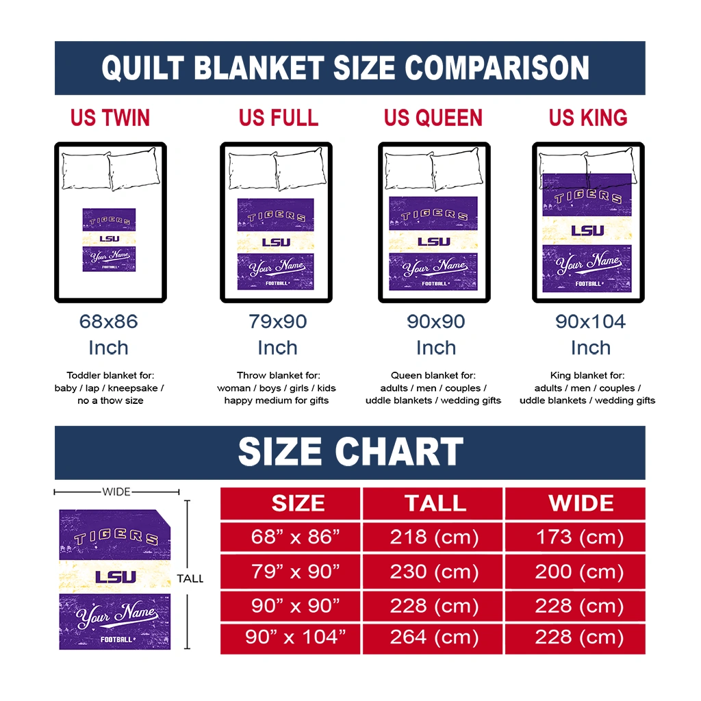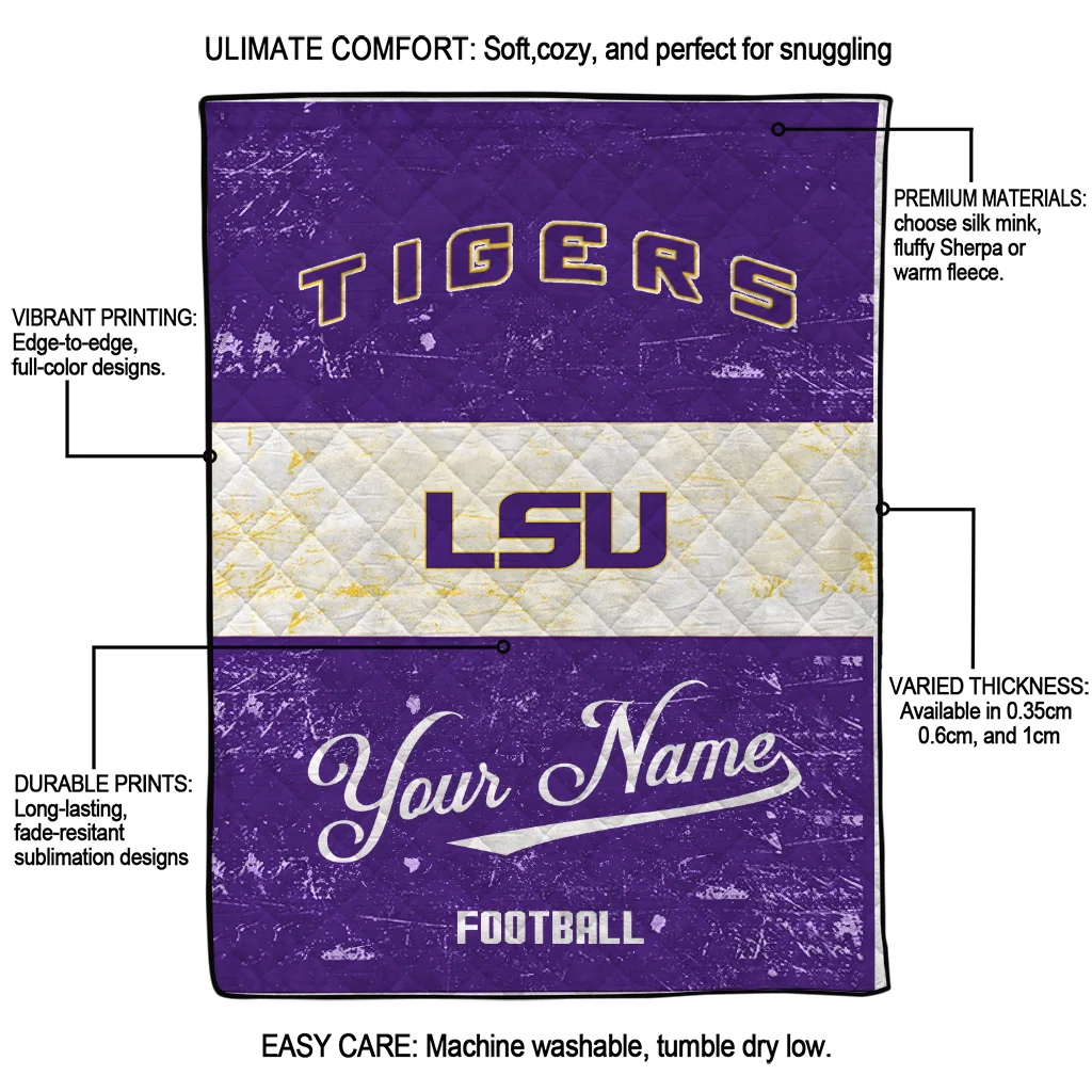 The Custom LSU Tigers Hibiscus Burst Purple White Quilt Blanket is more than a blanket—it’s everyday comfort, thoughtfully made. Crafted from premium quilting fabric with a soft microfiber touch, it offers a smooth hand-feel and lasting coziness. Layered quilting with a cotton-filled core provides adaptable warmth across seasons while maintaining a clean, tailored look on your bed or sofa.