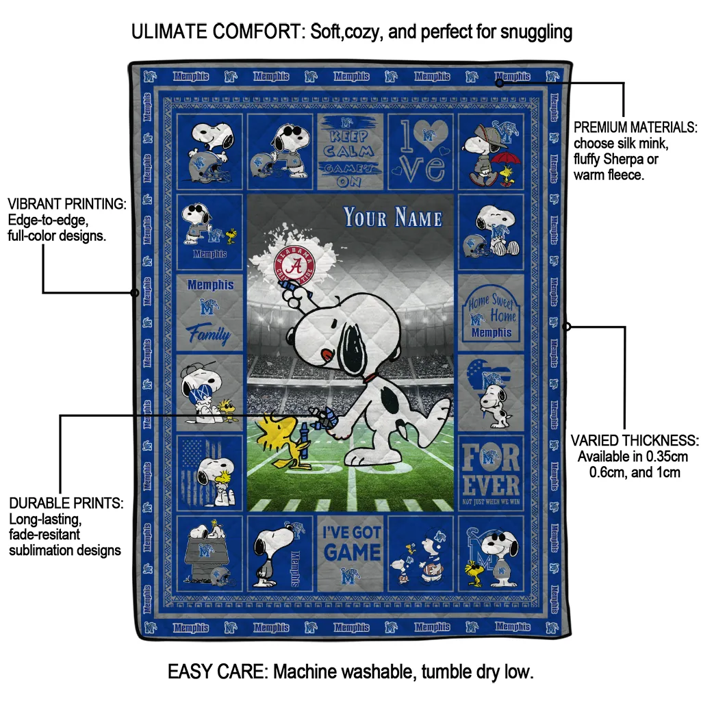 The Custom Memphis Tigers Snoopy Coach Blue Quilt Blanket is more than a blanket—it’s everyday comfort, thoughtfully made. Crafted from premium quilting fabric with a soft microfiber touch, it offers a smooth hand-feel and lasting coziness. Layered quilting with a cotton-filled core provides adaptable warmth across seasons while maintaining a clean, tailored look on your bed or sofa.