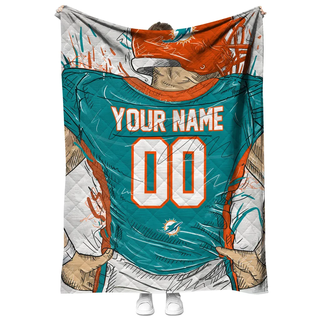 The Custom Miami Dolphins Player Sketch Aqua Gray Quilt Blanket is more than a blanket—it’s everyday comfort, thoughtfully made. Crafted from premium quilting fabric with a soft microfiber touch, it offers a smooth hand-feel and lasting coziness. Layered quilting with a cotton-filled core provides adaptable warmth across seasons while maintaining a clean, tailored look on your bed or sofa.