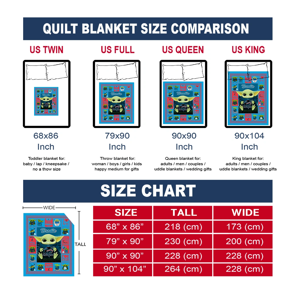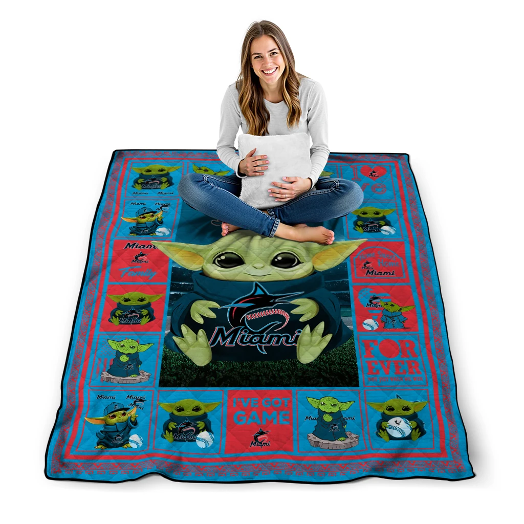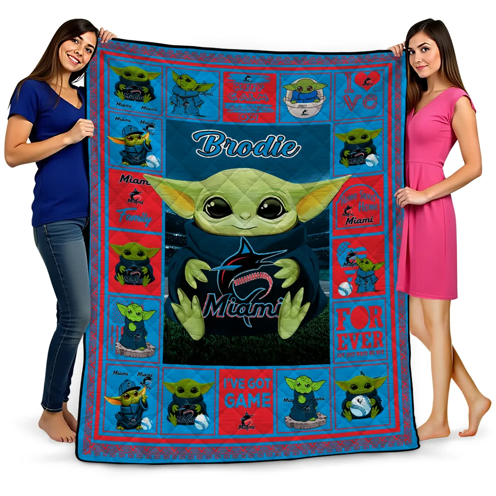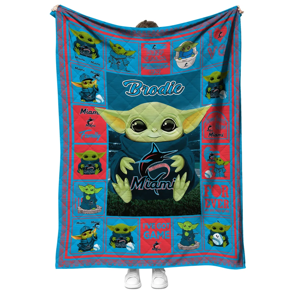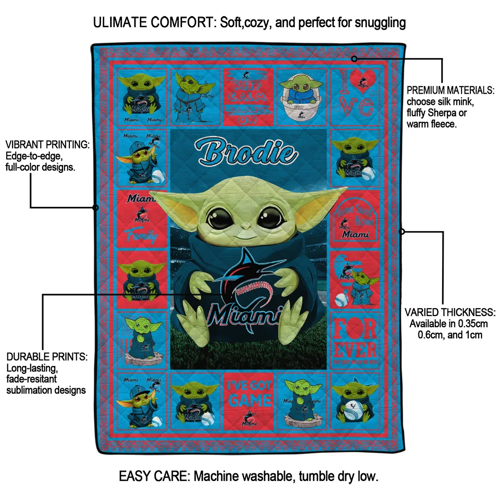 Wrap yourself in warmth and pride with the Custom Miami Marlins Yody Baby Motif Blue Quilt Blanket from the Miami Marlins Blankets collection at Yes That Blanket. Made from 100% premium quilting-weight polyester blended with a touch of microfiber, this quilt offers a smooth, soft finish you’ll love. Choose between two quilting styles—Stipple or Diagonal—and enjoy the comfort of a cotton-filled layer inside that adds extra coziness for every season. The border is available in classic black or white, giving your design a clean, timeless edge.