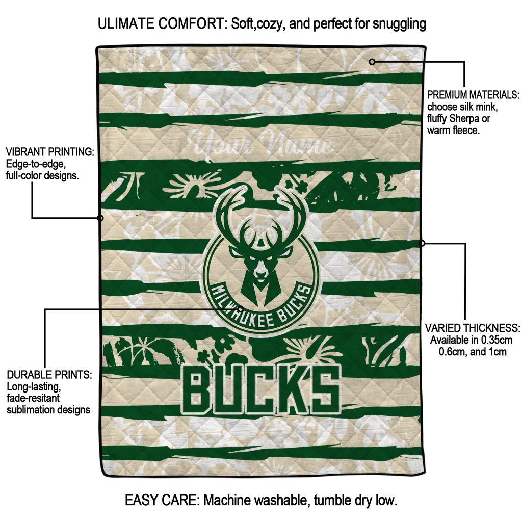 Custom Milwaukee Bucks Layered Florals Green White Quilt Blanket