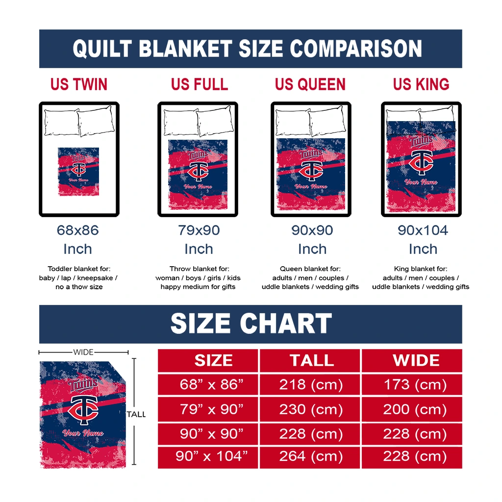Wrap yourself in warmth and pride with the Custom Minnesota Twins Brushstroke Layers Navy Quilt Blanket from the Minnesota Twins Blankets collection at Yes That Blanket. Made from 100% premium quilting-weight polyester blended with a touch of microfiber, this quilt offers a smooth, soft finish you’ll love. Choose between two quilting styles—Stipple or Diagonal—and enjoy the comfort of a cotton-filled layer inside that adds extra coziness for every season. The border is available in classic black or white, giving your design a clean, timeless edge.