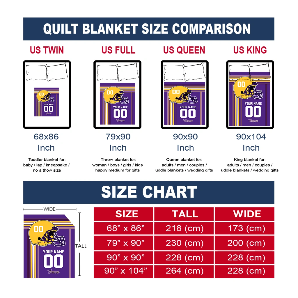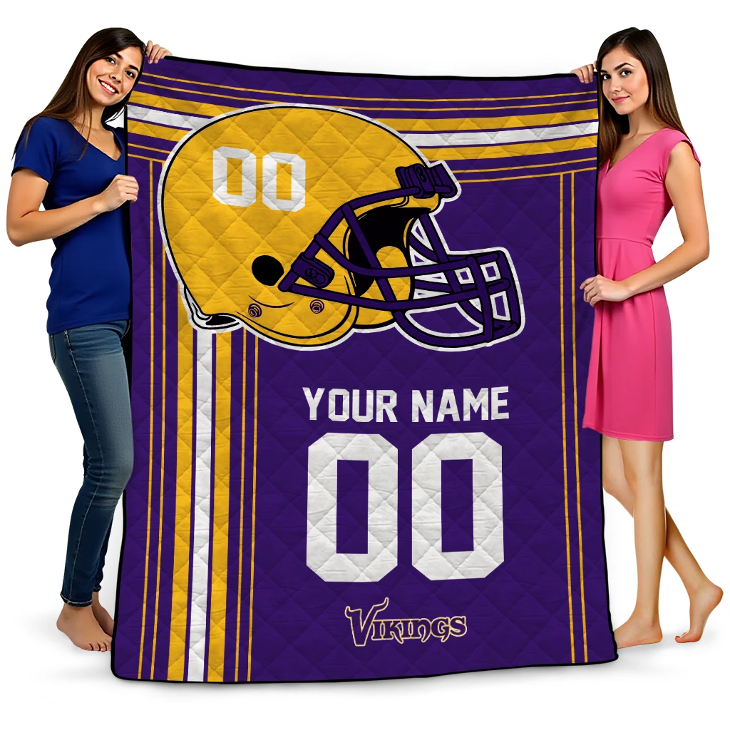 The Custom Minnesota Vikings Helmet Theme Purple Quilt Blanket is more than a blanket—it’s everyday comfort, thoughtfully made. Crafted from premium quilting fabric with a soft microfiber touch, it offers a smooth hand-feel and lasting coziness. Layered quilting with a cotton-filled core provides adaptable warmth across seasons while maintaining a clean, tailored look on your bed or sofa.