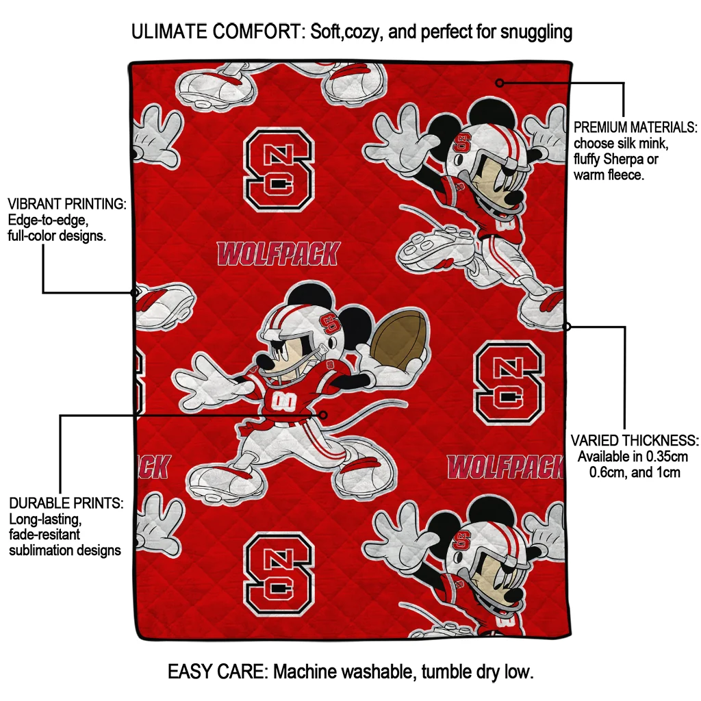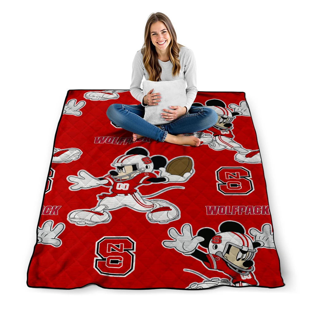 The Custom NC State Wolfpack Mickey Football Red Quilt Blanket is more than a blanket—it’s everyday comfort, thoughtfully made. Crafted from premium quilting fabric with a soft microfiber touch, it offers a smooth hand-feel and lasting coziness. Layered quilting with a cotton-filled core provides adaptable warmth across seasons while maintaining a clean, tailored look on your bed or sofa.