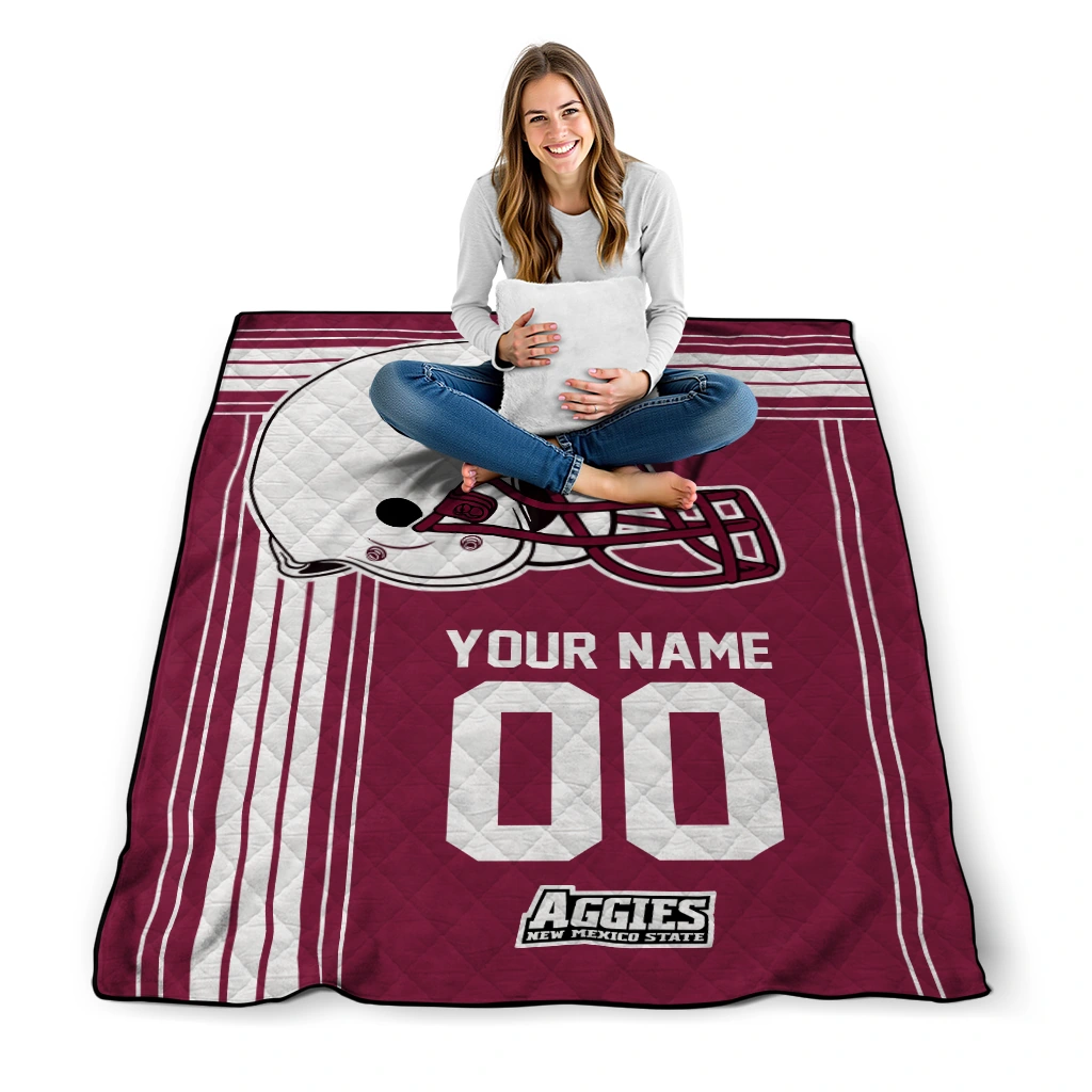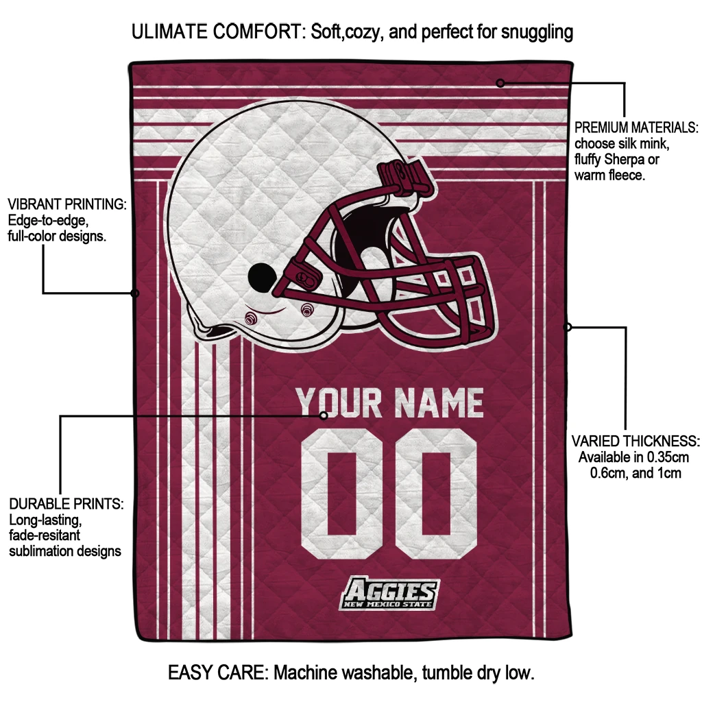 The Custom New Mexico State Aggies Helmet Theme Crimson Quilt Blanket is more than a blanket—it’s everyday comfort, thoughtfully made. Crafted from premium quilting fabric with a soft microfiber touch, it offers a smooth hand-feel and lasting coziness. Layered quilting with a cotton-filled core provides adaptable warmth across seasons while maintaining a clean, tailored look on your bed or sofa.