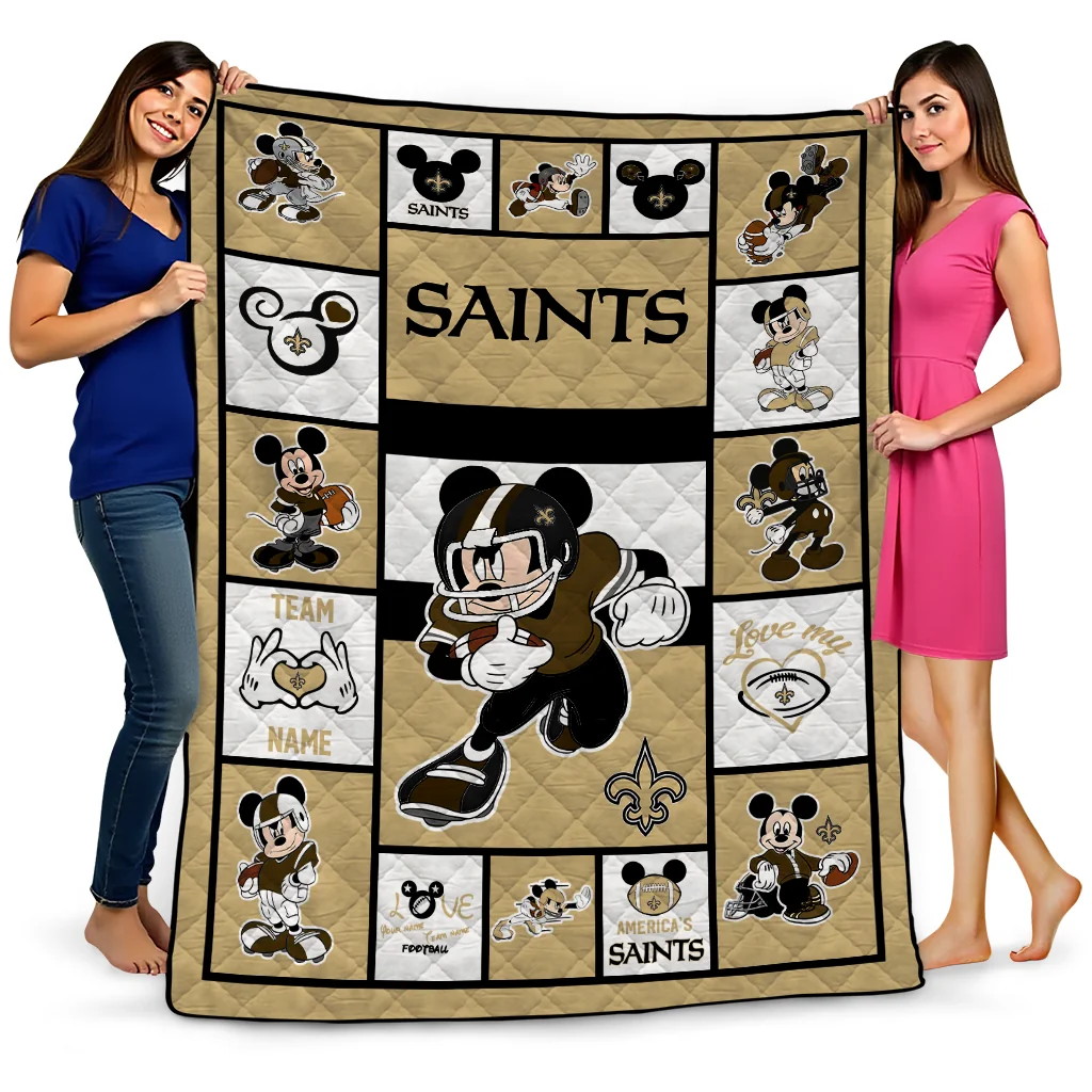 The Custom New Orleans Saints Mickey Crimson Gold White Quilt Blanket is more than a blanket—it’s everyday comfort, thoughtfully made. Crafted from premium quilting fabric with a soft microfiber touch, it offers a smooth hand-feel and lasting coziness. Layered quilting with a cotton-filled core provides adaptable warmth across seasons while maintaining a clean, tailored look on your bed or sofa.