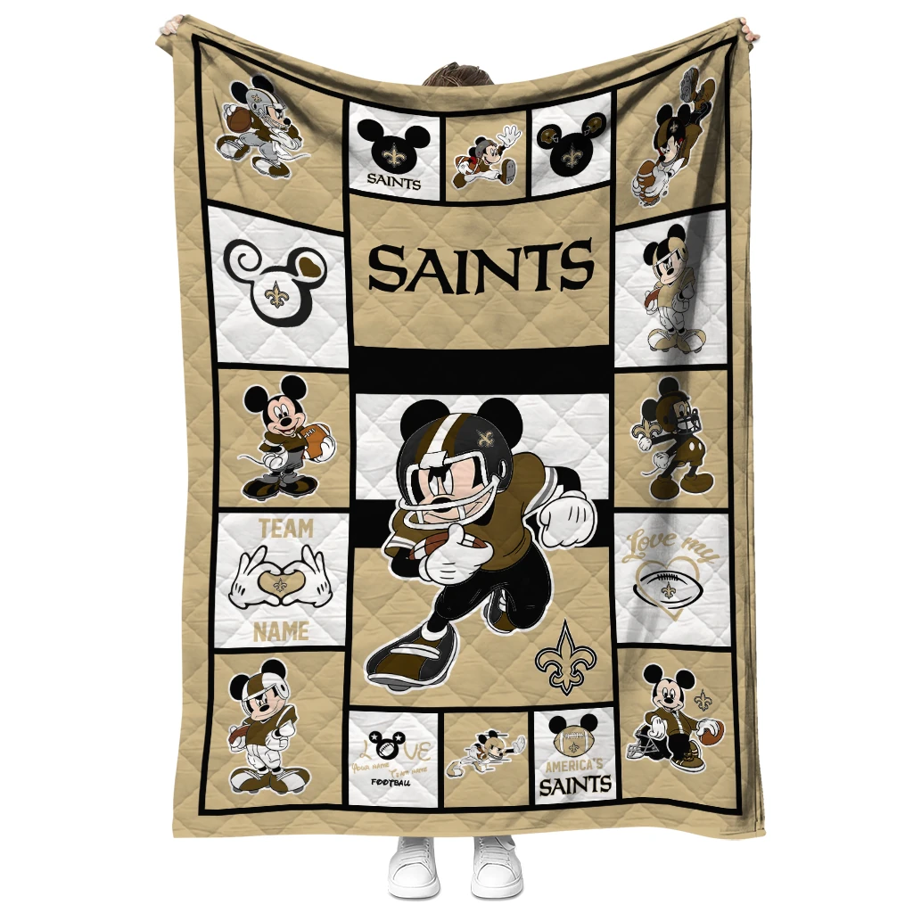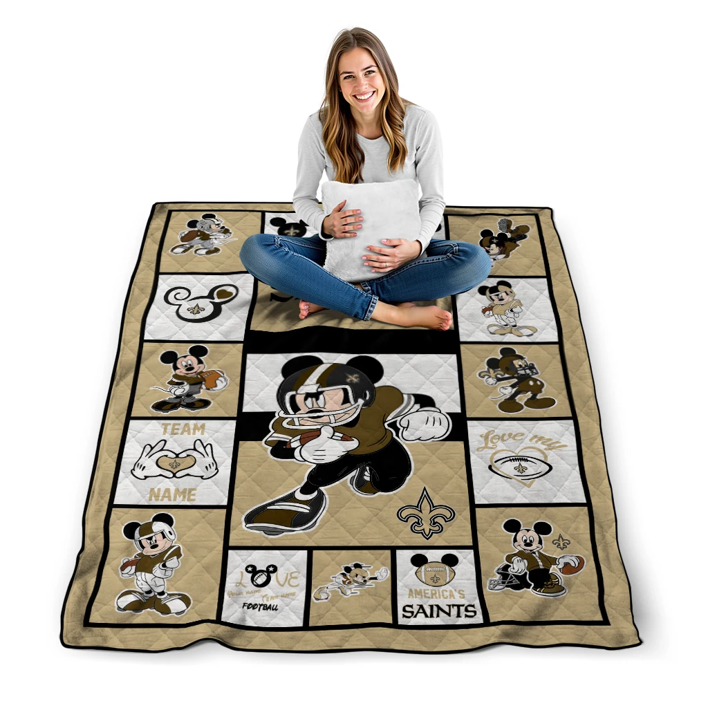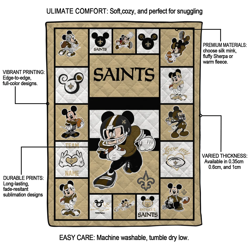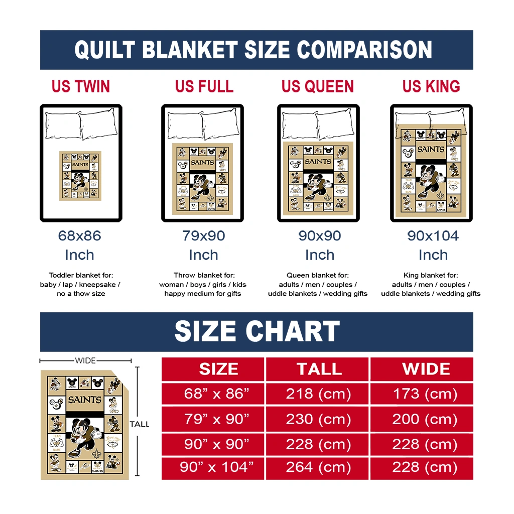 Wrap yourself in warmth and pride with the Custom New Orleans Saints Mickey Crimson Gold White Quilt Blanket from the New Orleans Saints Blankets collection at Yes That Blanket. Made from 100% premium quilting-weight polyester blended with a touch of microfiber, this quilt offers a smooth, soft finish you’ll love. Choose between two quilting styles—Stipple or Diagonal—and enjoy the comfort of a cotton-filled layer inside that adds extra coziness for every season. The border is available in classic black or white, giving your design a clean, timeless edge.