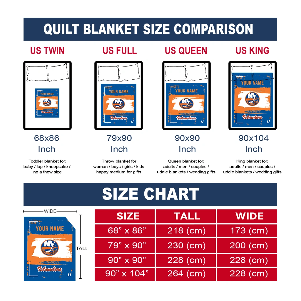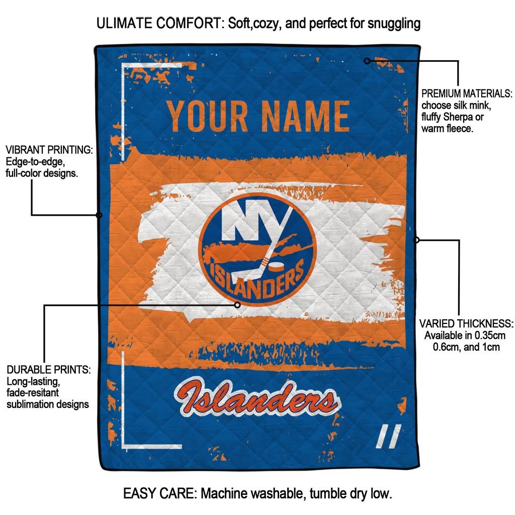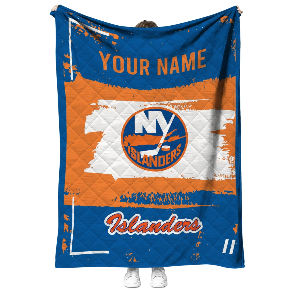 Wrap yourself in warmth and pride with the Custom New York Islanders Grunge Patch Blue White Quilt Blanket from the New York Islanders Blankets collection at Yes That Blanket. Made from 100% premium quilting-weight polyester blended with a touch of microfiber, this quilt offers a smooth, soft finish you’ll love. Choose between two quilting styles—Stipple or Diagonal—and enjoy the comfort of a cotton-filled layer inside that adds extra coziness for every season. The border is available in classic black or white, giving your design a clean, timeless edge.
