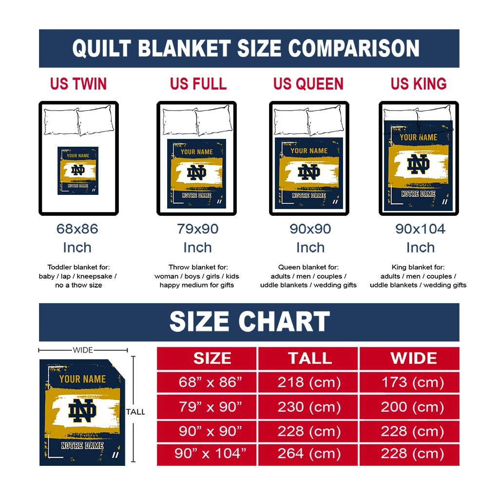Wrap yourself in warmth and pride with the Custom Notre Dame Fighting Irish Grunge Patch Navy White Quilt Blanket from the Notre Dame Fighting Irish Blankets collection at Yes That Blanket. Made from 100% premium quilting-weight polyester blended with a touch of microfiber, this quilt offers a smooth, soft finish you’ll love. Choose between two quilting styles—Stipple or Diagonal—and enjoy the comfort of a cotton-filled layer inside that adds extra coziness for every season. The border is available in classic black or white, giving your design a clean, timeless edge.