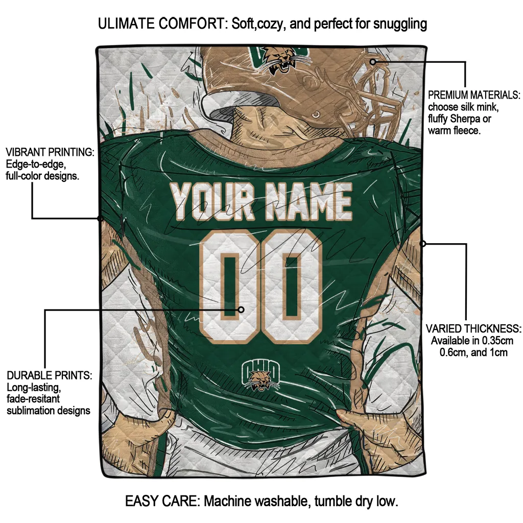 The Custom Ohio Bobcats Player Sketch Green Gray Quilt Blanket is more than a blanket—it’s everyday comfort, thoughtfully made. Crafted from premium quilting fabric with a soft microfiber touch, it offers a smooth hand-feel and lasting coziness. Layered quilting with a cotton-filled core provides adaptable warmth across seasons while maintaining a clean, tailored look on your bed or sofa.