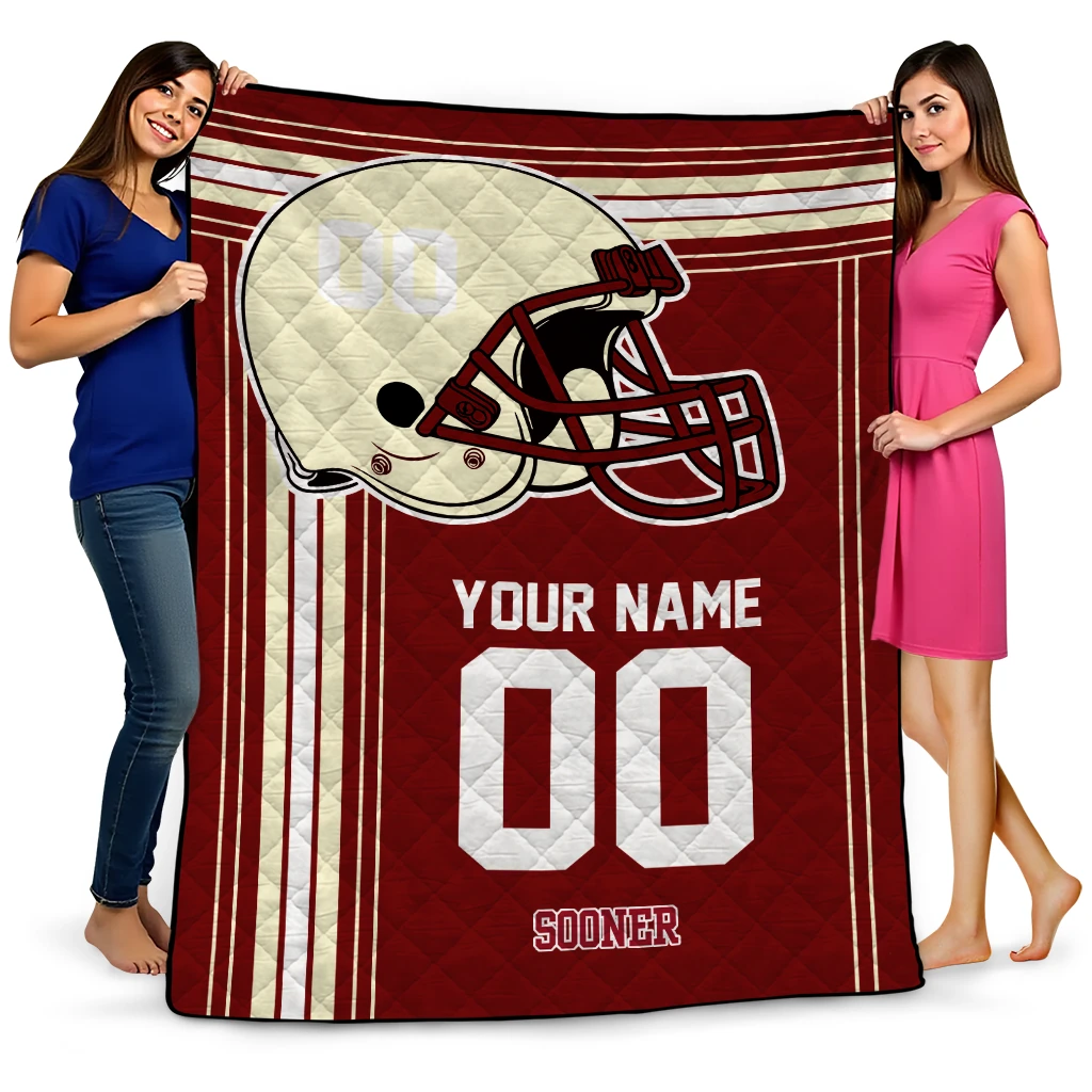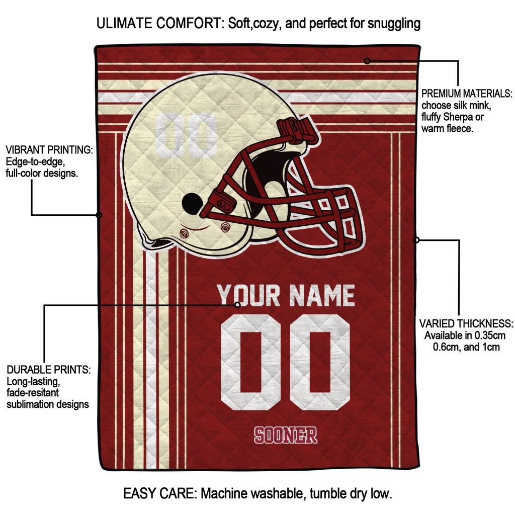 The Custom Oklahoma Sooners Helmet Theme Crimson Quilt Blanket is more than a blanket—it’s everyday comfort, thoughtfully made. Crafted from premium quilting fabric with a soft microfiber touch, it offers a smooth hand-feel and lasting coziness. Layered quilting with a cotton-filled core provides adaptable warmth across seasons while maintaining a clean, tailored look on your bed or sofa.