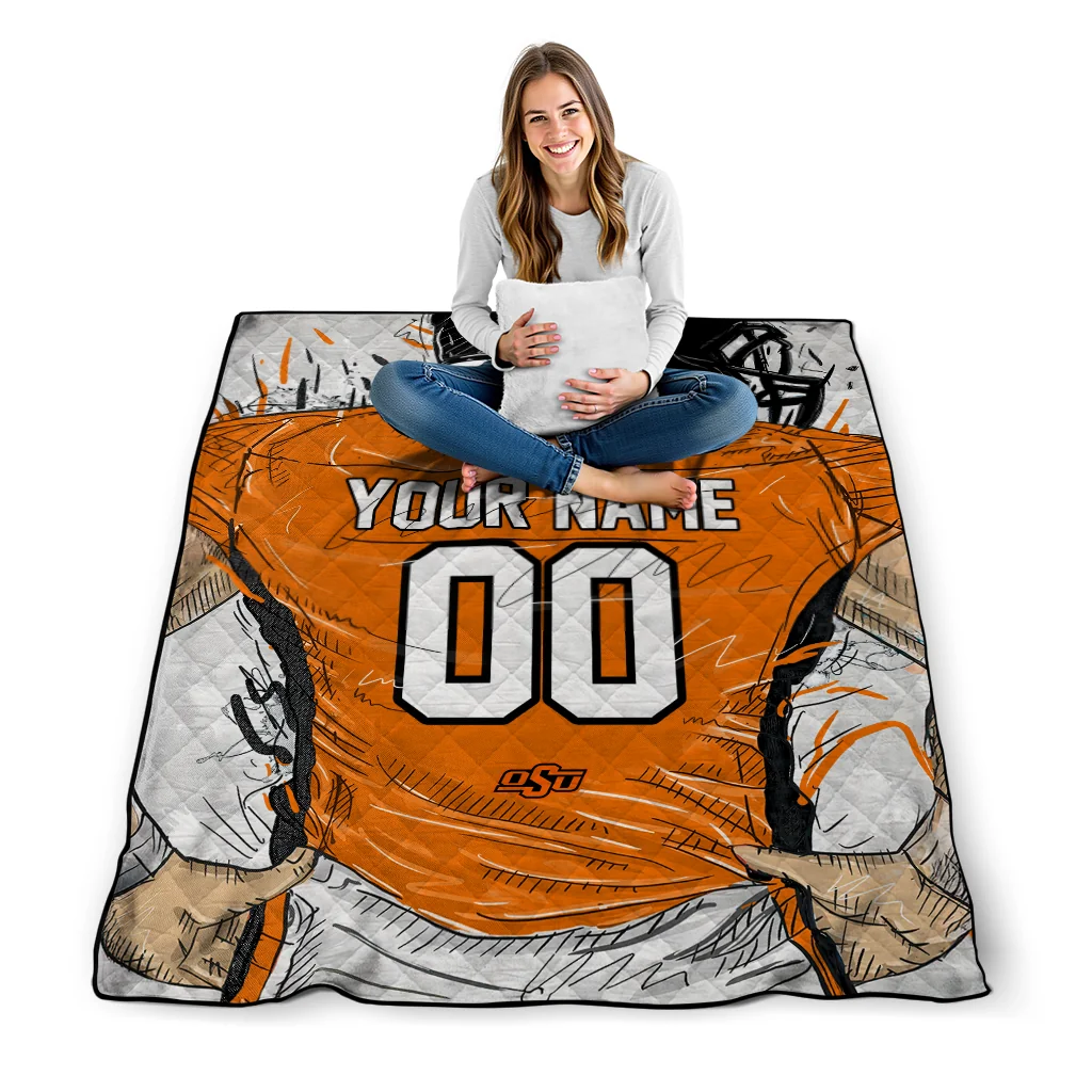 The Custom Oklahoma State Cowboys Player Sketch Orange Gray Quilt Blanket is more than a blanket—it’s everyday comfort, thoughtfully made. Crafted from premium quilting fabric with a soft microfiber touch, it offers a smooth hand-feel and lasting coziness. Layered quilting with a cotton-filled core provides adaptable warmth across seasons while maintaining a clean, tailored look on your bed or sofa.