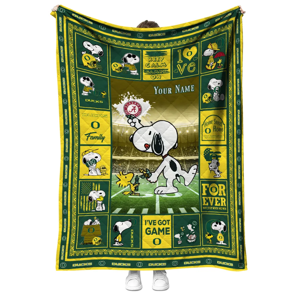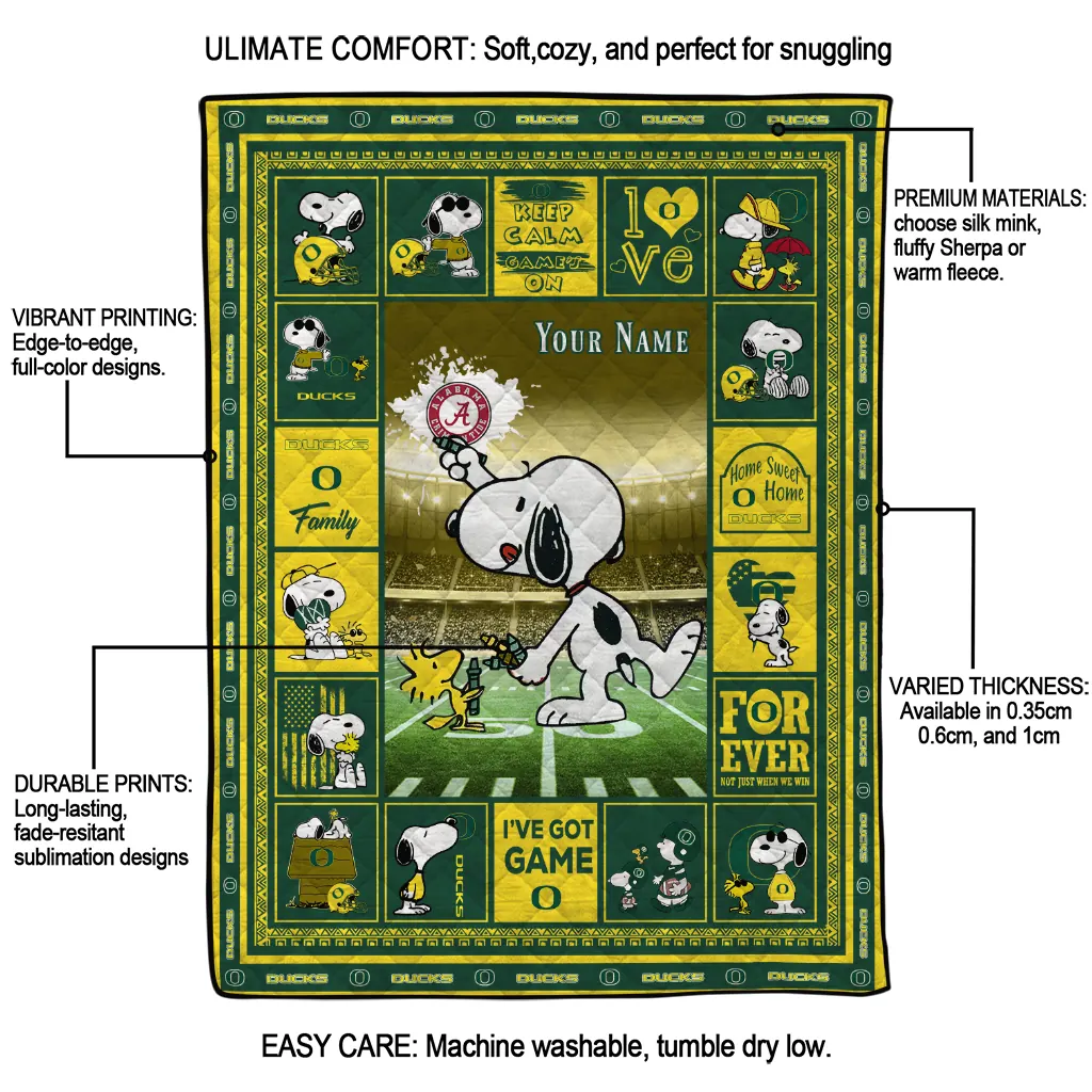 Wrap yourself in warmth and pride with the Custom Oregon Ducks Snoopy Coach Green Quilt Blanket from the Oregon Ducks Blankets collection at Yes That Blanket. Made from 100% premium quilting-weight polyester blended with a touch of microfiber, this quilt offers a smooth, soft finish you’ll love. Choose between two quilting styles—Stipple or Diagonal—and enjoy the comfort of a cotton-filled layer inside that adds extra coziness for every season. The border is available in classic black or white, giving your design a clean, timeless edge.