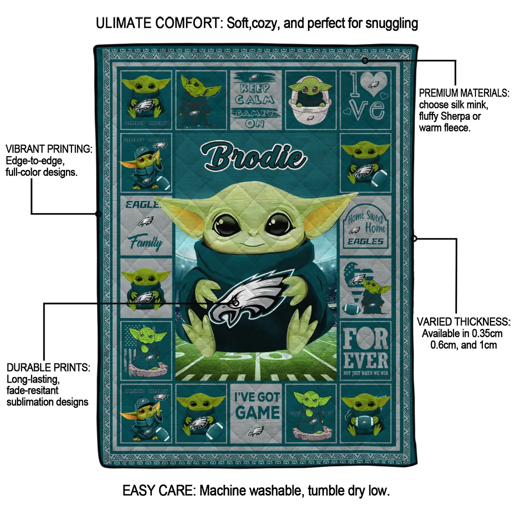 Wrap yourself in warmth and pride with the Custom Philadelphia Eagles Yody Baby Pattern Green Quilt Blanket from the Philadelphia Eagles Blankets collection at Yes That Blanket. Made from 100% premium quilting-weight polyester blended with a touch of microfiber, this quilt offers a smooth, soft finish you’ll love. Choose between two quilting styles—Stipple or Diagonal—and enjoy the comfort of a cotton-filled layer inside that adds extra coziness for every season. The border is available in classic black or white, giving your design a clean, timeless edge.