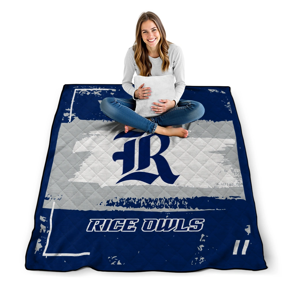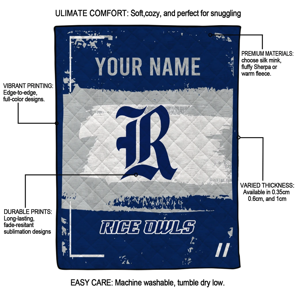 Wrap yourself in warmth and pride with the Custom Rice Owls Grunge Patch Navy Blue White Quilt Blanket from the Rice Owls Blankets collection at Yes That Blanket. Made from 100% premium quilting-weight polyester blended with a touch of microfiber, this quilt offers a smooth, soft finish you’ll love. Choose between two quilting styles—Stipple or Diagonal—and enjoy the comfort of a cotton-filled layer inside that adds extra coziness for every season. The border is available in classic black or white, giving your design a clean, timeless edge.