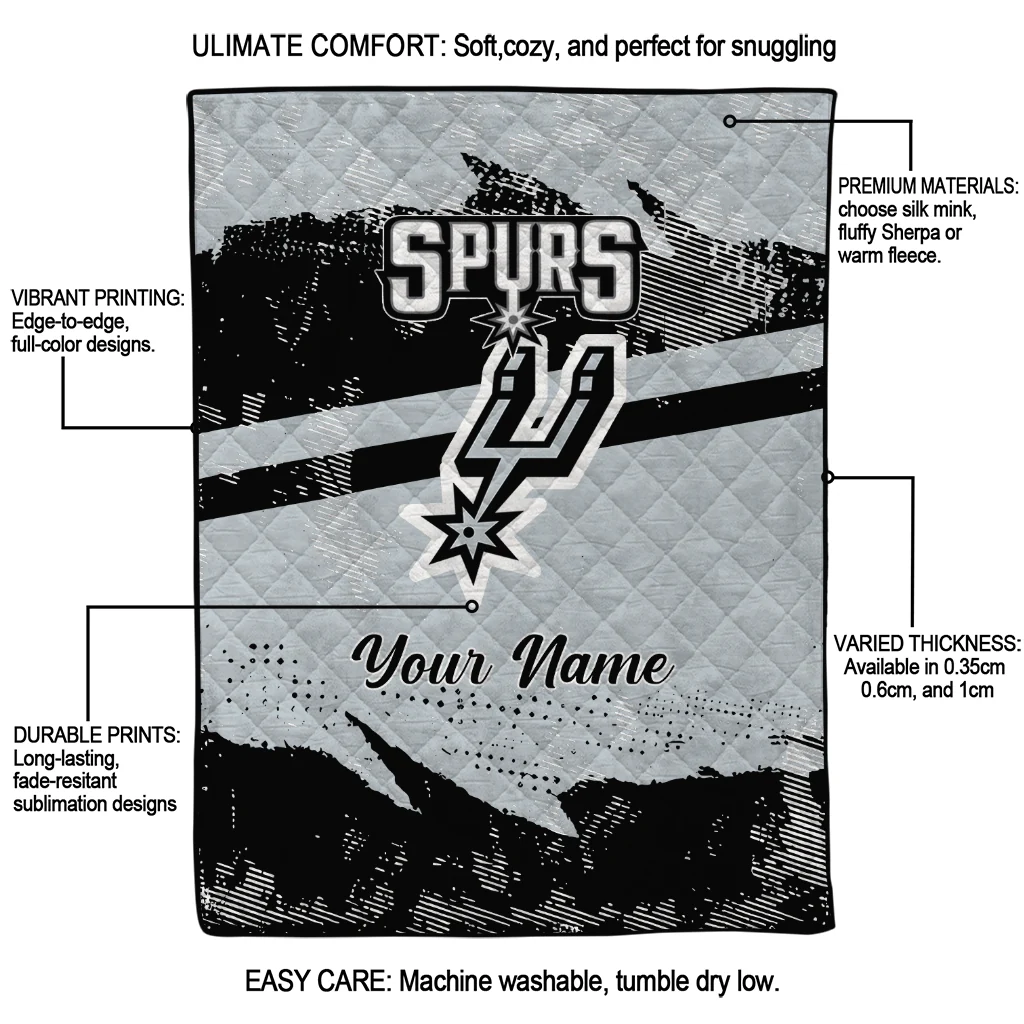 Wrap yourself in warmth and pride with the Custom San Antonio Spurs Brushstroke Layers Silver Quilt Blanket from the San Antonio Spurs Blankets collection at Yes That Blanket. Made from 100% premium quilting-weight polyester blended with a touch of microfiber, this quilt offers a smooth, soft finish you’ll love. Choose between two quilting styles—Stipple or Diagonal—and enjoy the comfort of a cotton-filled layer inside that adds extra coziness for every season. The border is available in classic black or white, giving your design a clean, timeless edge.