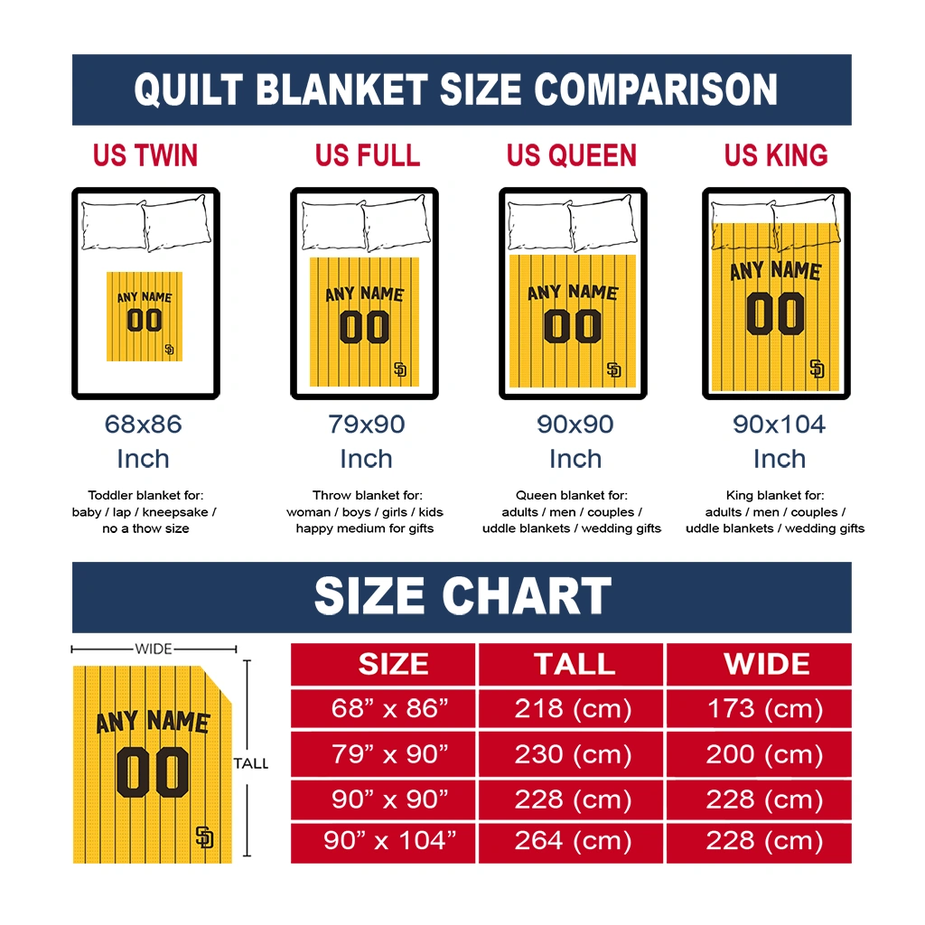 Wrap yourself in warmth and pride with the Custom San Diego Padres Pin Dot Quilt Blanket from the San Diego Padres Blankets collection at Yes That Blanket. Made from 100% premium quilting-weight polyester blended with a touch of microfiber, this quilt offers a smooth, soft finish you’ll love. Choose between two quilting styles—Stipple or Diagonal—and enjoy the comfort of a cotton-filled layer inside that adds extra coziness for every season. The border is available in classic black or white, giving your design a clean, timeless edge.