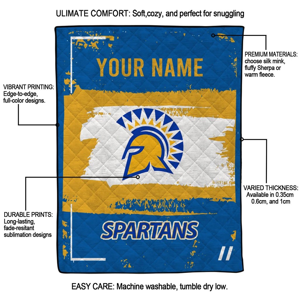 Wrap yourself in warmth and pride with the Custom San Jose State Spartans Grunge Patch Blue White Quilt Blanket from the San Jose State Spartans Blankets collection at Yes That Blanket. Made from 100% premium quilting-weight polyester blended with a touch of microfiber, this quilt offers a smooth, soft finish you’ll love. Choose between two quilting styles—Stipple or Diagonal—and enjoy the comfort of a cotton-filled layer inside that adds extra coziness for every season. The border is available in classic black or white, giving your design a clean, timeless edge.
