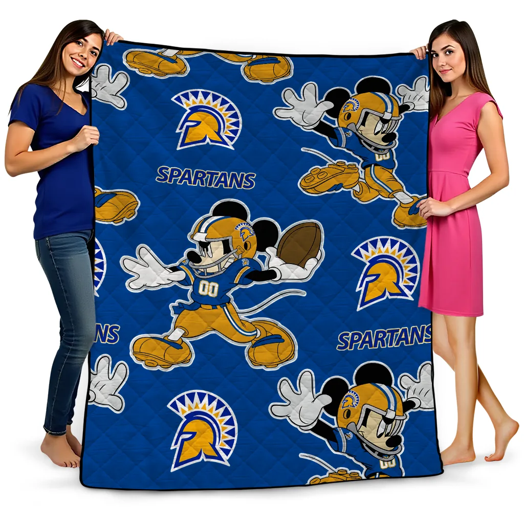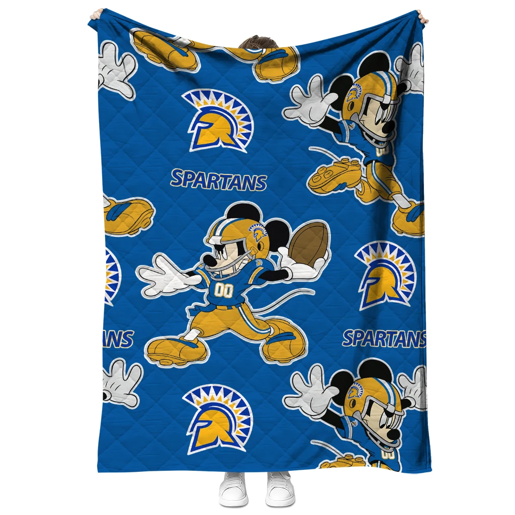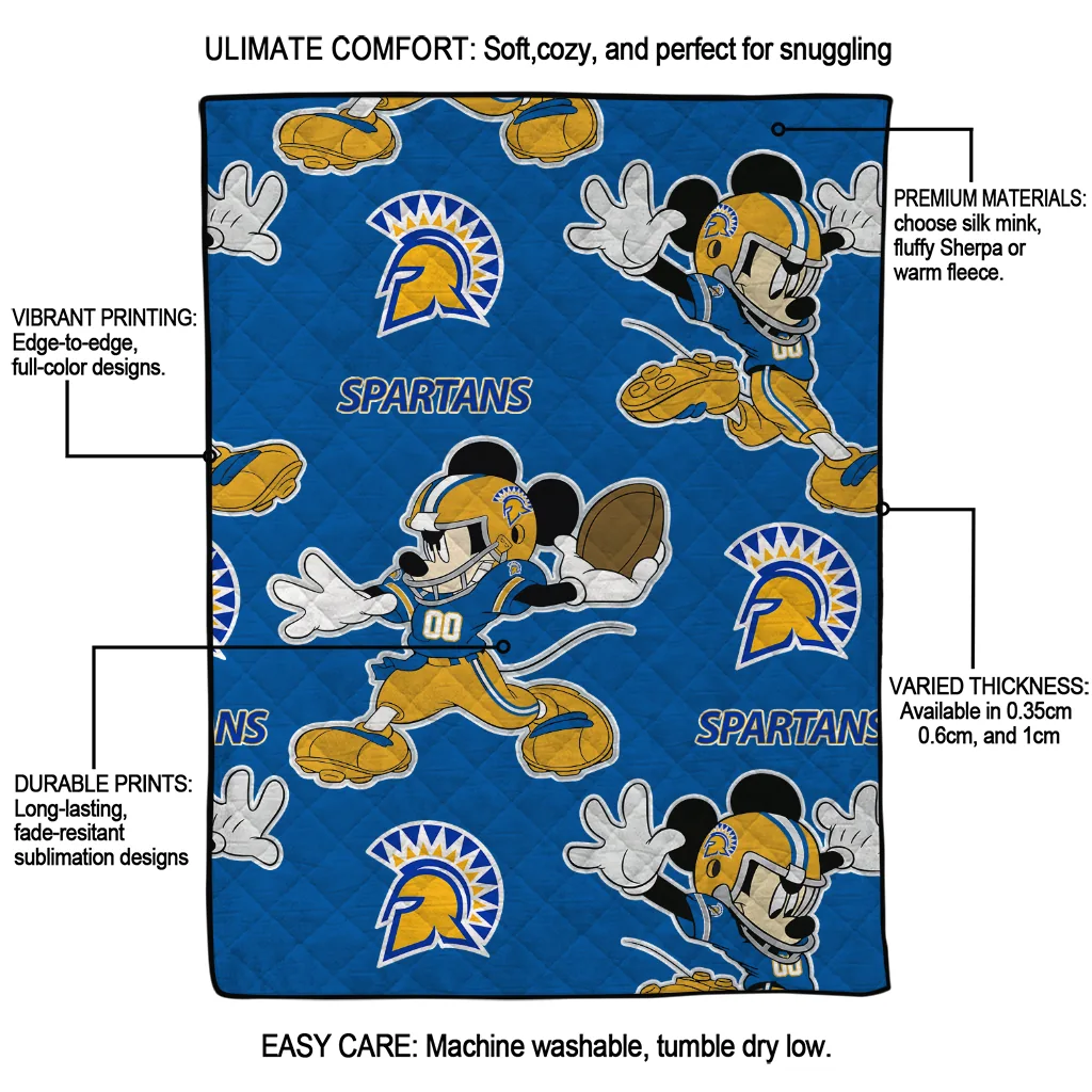 The Custom San Jose State Spartans Mickey Football Blue Quilt Blanket is more than a blanket—it’s everyday comfort, thoughtfully made. Crafted from premium quilting fabric with a soft microfiber touch, it offers a smooth hand-feel and lasting coziness. Layered quilting with a cotton-filled core provides adaptable warmth across seasons while maintaining a clean, tailored look on your bed or sofa.