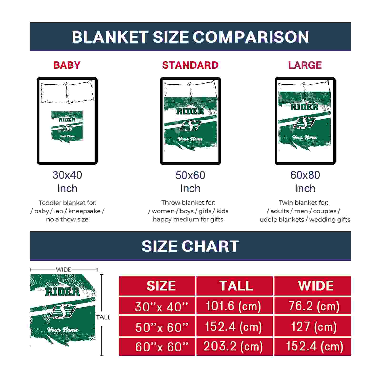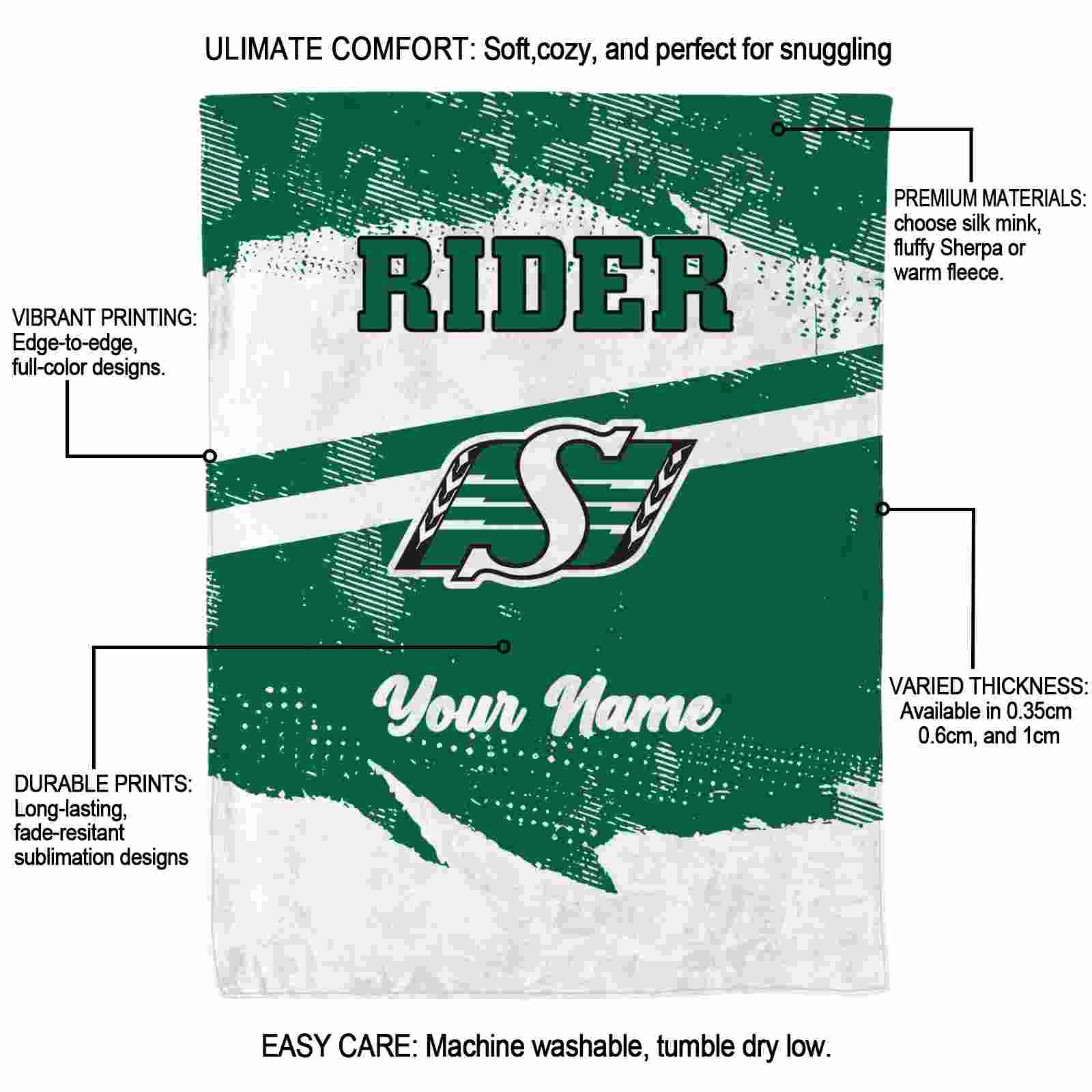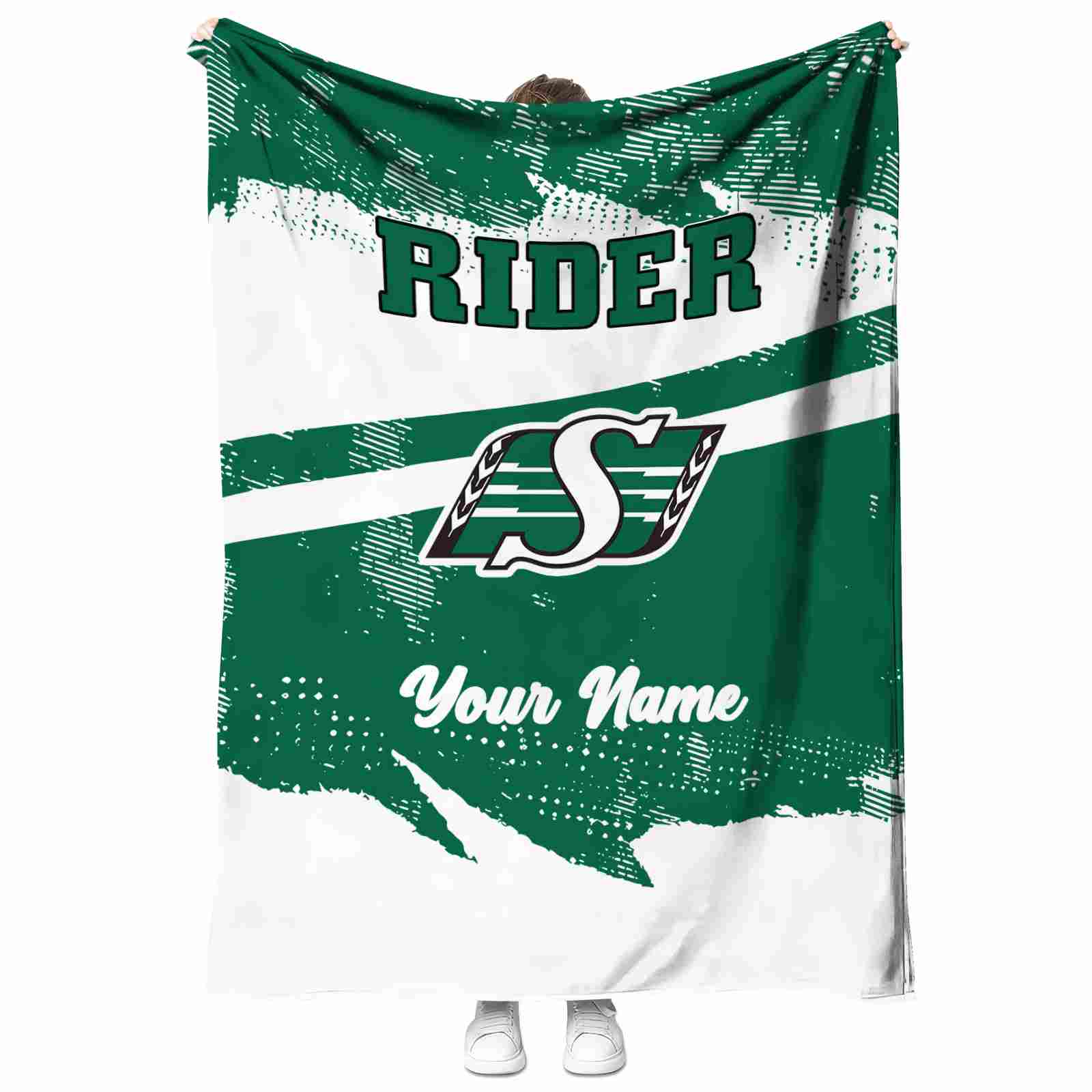 Without a doubt, the Custom Saskatchewan Roughriders Grunge Streaks Green Blanket from Saskatchewan Roughriders Blankets collection is offering true fans a chance to showcase passion in a cool way. Personalize it with your favorite team's logo or a meaningful name to make it uniquely yours. Isn't that great? The full-color print ensures vibrant, edge-to-edge designs, bringing your sports enthusiasm to life!